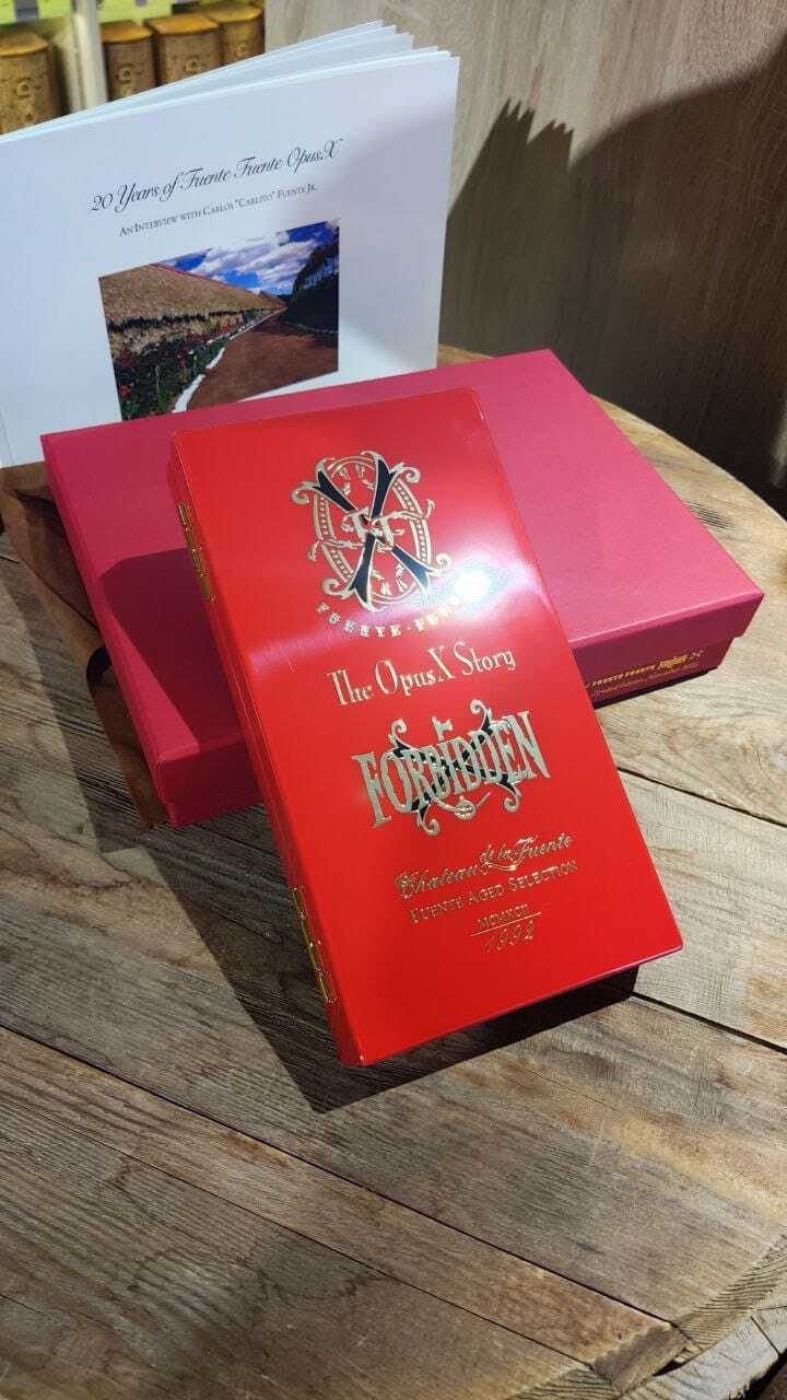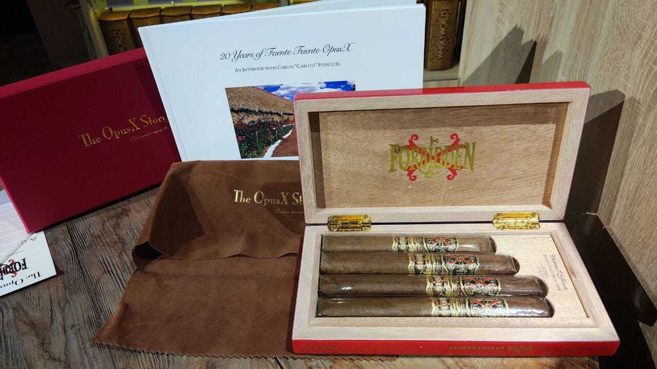 Каждый выпуск (всего 1575 наборов) сопровождается специальным изданием «20 Years of Fuente Fuente OpusX» и четырьмя редкими винтажными сигарами Fuente Fuente Forbidden X. Они скручены из очень старых табаков легендарного табачного запаса семьи Фуэнте и обернуты покровным листом, выращенным в Chateau de la Fuente.