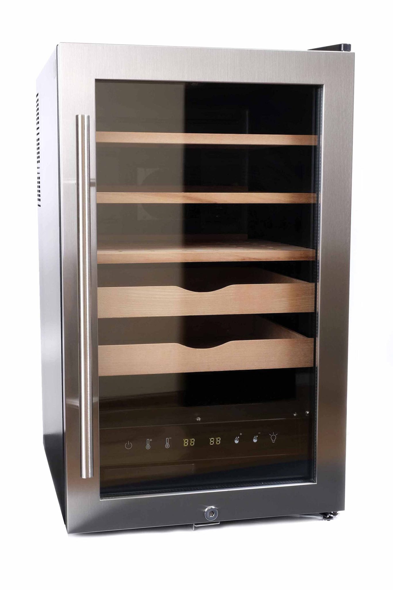 Современный хьюмидор-шкаф Howard Miller позволяет хранить до 250 сигар в комфортных климатических условиях по принципу "залил воду и забыл на месяц", т.е. сводит процесс ухода за сигарами к разумному минимуму. Внутри шкафа поддерживаются оптимальные температура и влажность, при которых сигары сохраняют качество и вкус. Дверца с антиультрафиолетовым стеклопакетом предохраняет содержимое от воздействия солнечного света. Габаритные размеры (ШхГхВ): 345x510x480 мм. Размер упаковки (ШхГхВ): 385x560x495 мм. Внутренний объем / размеры хьюмидорной камеры (ШхГхВ): 33 литра / 275x325x365 мм. Масса нетто / с упаковкой: 12 кг / 14 кг. Вместимость 120-250 сигар в зависимости от формата и индивидуальной упаковки (в коробках/тубах/россыпью). Материал корпуса: эмалированная сталь, пластик. Материал дверцы: Тонированный стеклопакет с УФ-защитой. Материал полок и лотков: испанский кедр. Номинальная потребляемая мощность 65 Ватт. Параметры электросети: 220-240 Вольт / 50-60 Герц. Условия эксплуатации от +16 до +28 C. Управление температурой электронное в диапазоне 16-22 С. Управление влажностью обеспечивается положением ёмкости с водой относительно вентилятора и регулировкой температуры: повышение температуры в камере устройства автоматически увеличивает влажность, понижение температуры уменьшает влажность. Контроль уровня влажности осуществляется визуально по стрелочному гигрометру. Расход воды примерно 90 мл в неделю ~ одна заправка штатной емкости в месяц. Уровень шума 25 Дб (практически бесшумно). Подсветка белая, светодиодная. Возможности встраивания в мебель нет, для вентиляции необходимо минимум 10-15 см свободного пространства сзади и сбоку. Производитель оставляет за собой право без предварительного уведомления вносить незначительные изменения в конструкцию или комплектацию изделия с целью улучшения его свойств.