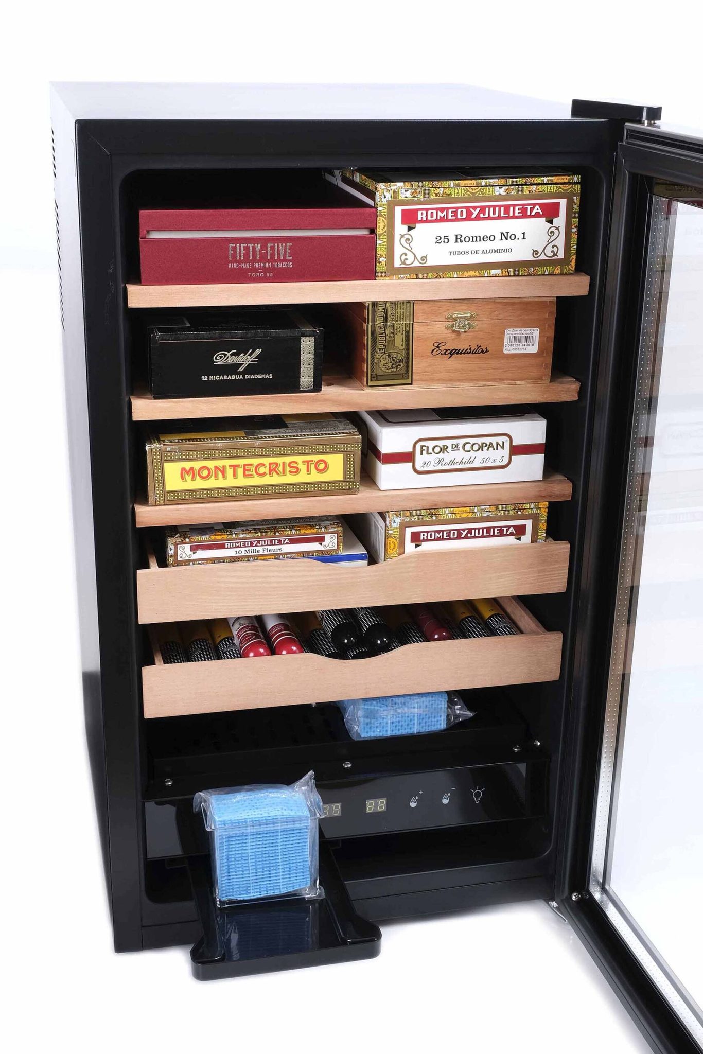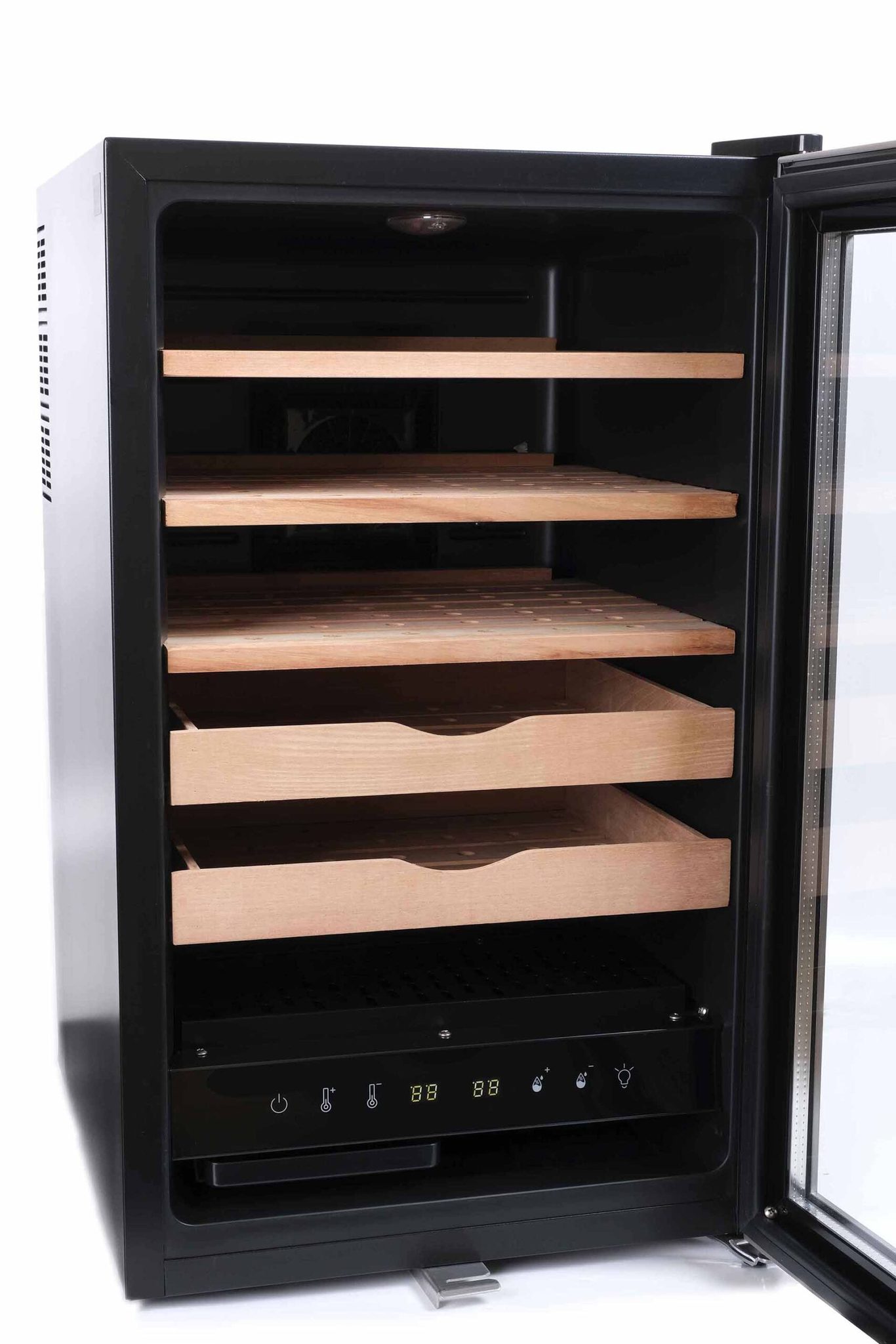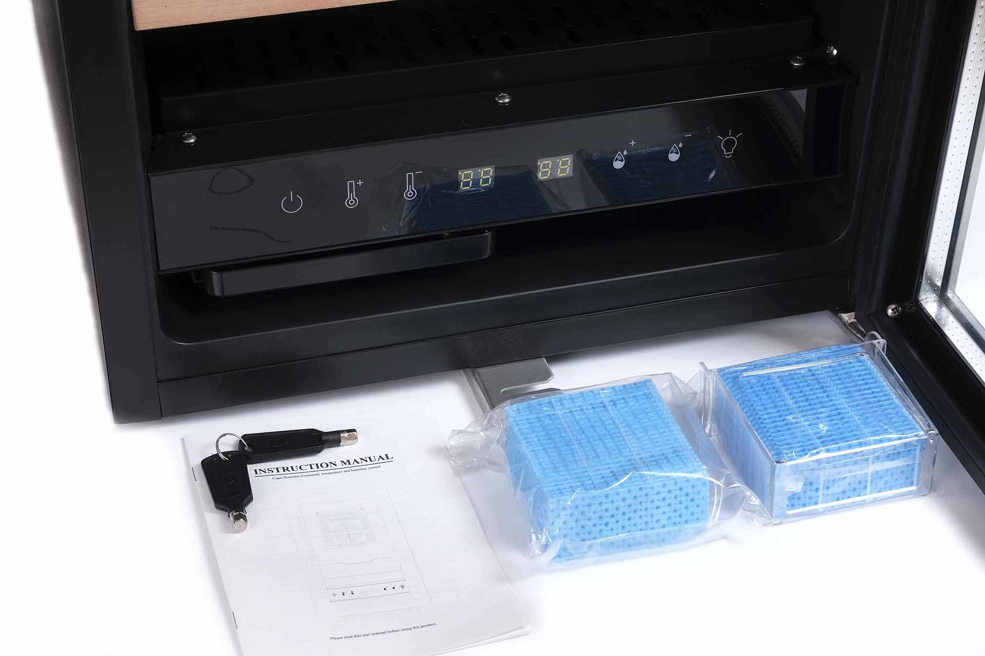 Позволяет хранить до 350 сигар в комфортных климатических условиях по принципу «загрузил сигары и забыл», т.е. сводит процесс ухода к минимуму (объема встроенного лотка для воды хватет примерно на месяц эксплуатации). Внутри шкафа автоматически поддерживаются заданные температура и влажность, оптимальные для сохранения качества и вкуса сигар в течение длительного времени. Дверца с антиультрафиолетовым стеклопакетом предохраняет содержимое от воздействия солнечного света, а также может закрываться на ключ. Вместимость до 500 сигар в зависимости от формата и индивидуальной упаковки (в коробках/тубах/поштучно/россыпью). Материал корпуса: эмалированная сталь, пластик (внутри). Управление температурой: термоэлектрический блок охлаждения с автоматикой, температура задается на дисплее в диапазоне 16-22 С шагом в 1 градус. Управление влажностью: отдельный электронный блок с увлажнителем и вентиляторами, влажность задается на дисплее в диапазоне 65-75% с шагом в 1%. Расход воды примерно 100 мл в неделю ~ одна заправка штатного лотка на месяц. Уровень шума — до 30 Дб (Тихо). Подсветка белая, светодиодная. Возможности встраивания в мебель нет, для вентиляции необходимо минимум 10-15 см свободного пространства сзади и сбоку. Производитель оставляет за собой право без предварительного уведомления вносить незначительные изменения в конструкцию или комплектацию изделия с целью улучшения его свойств.