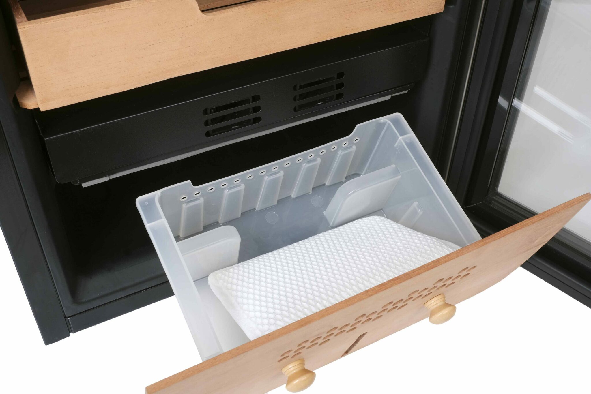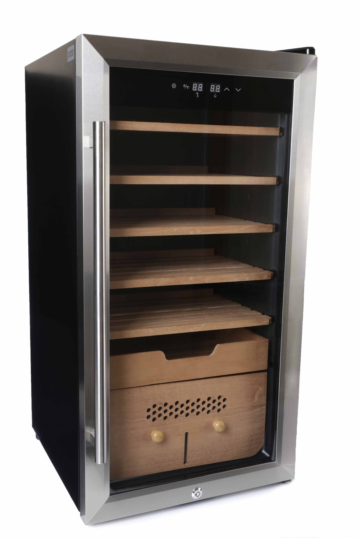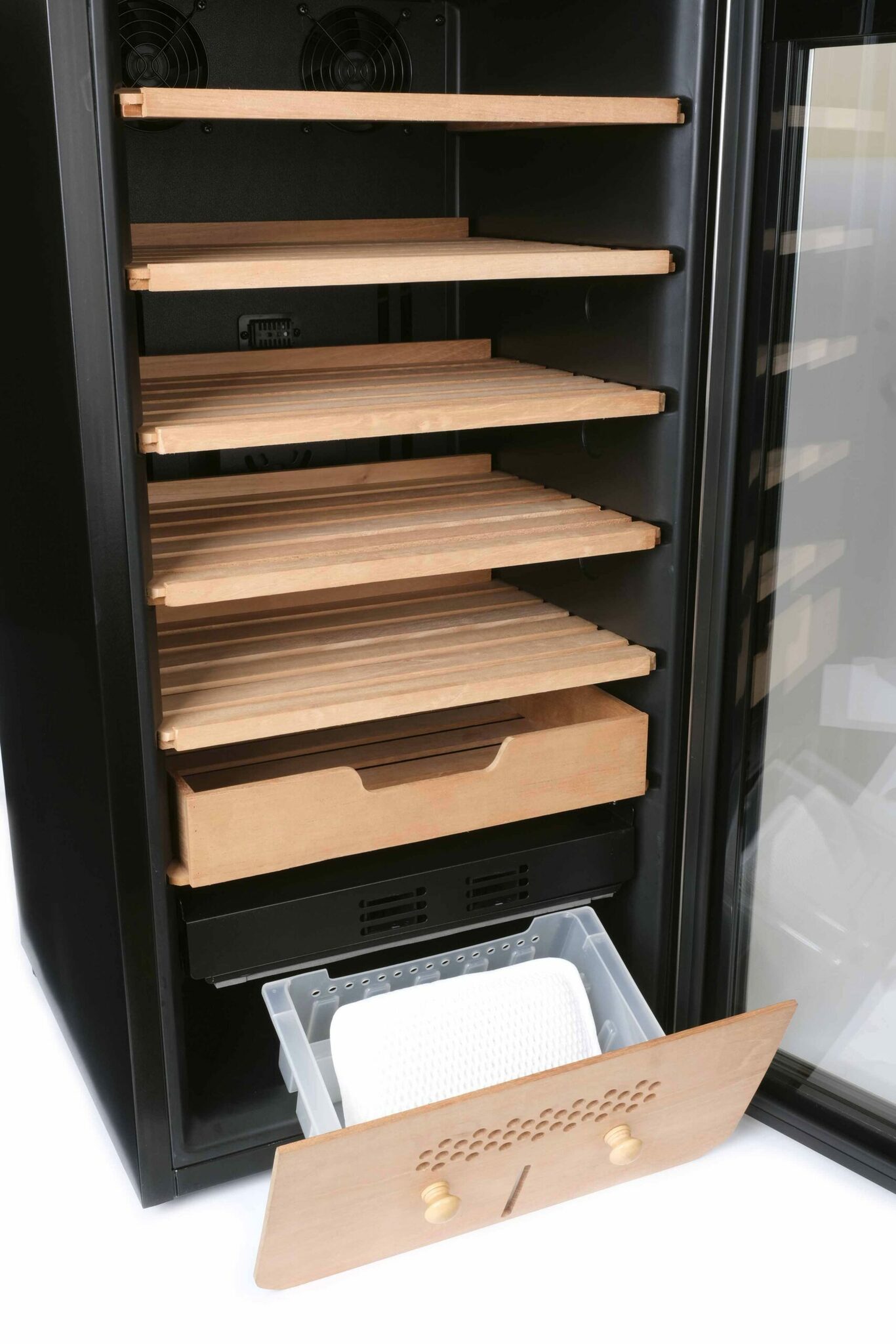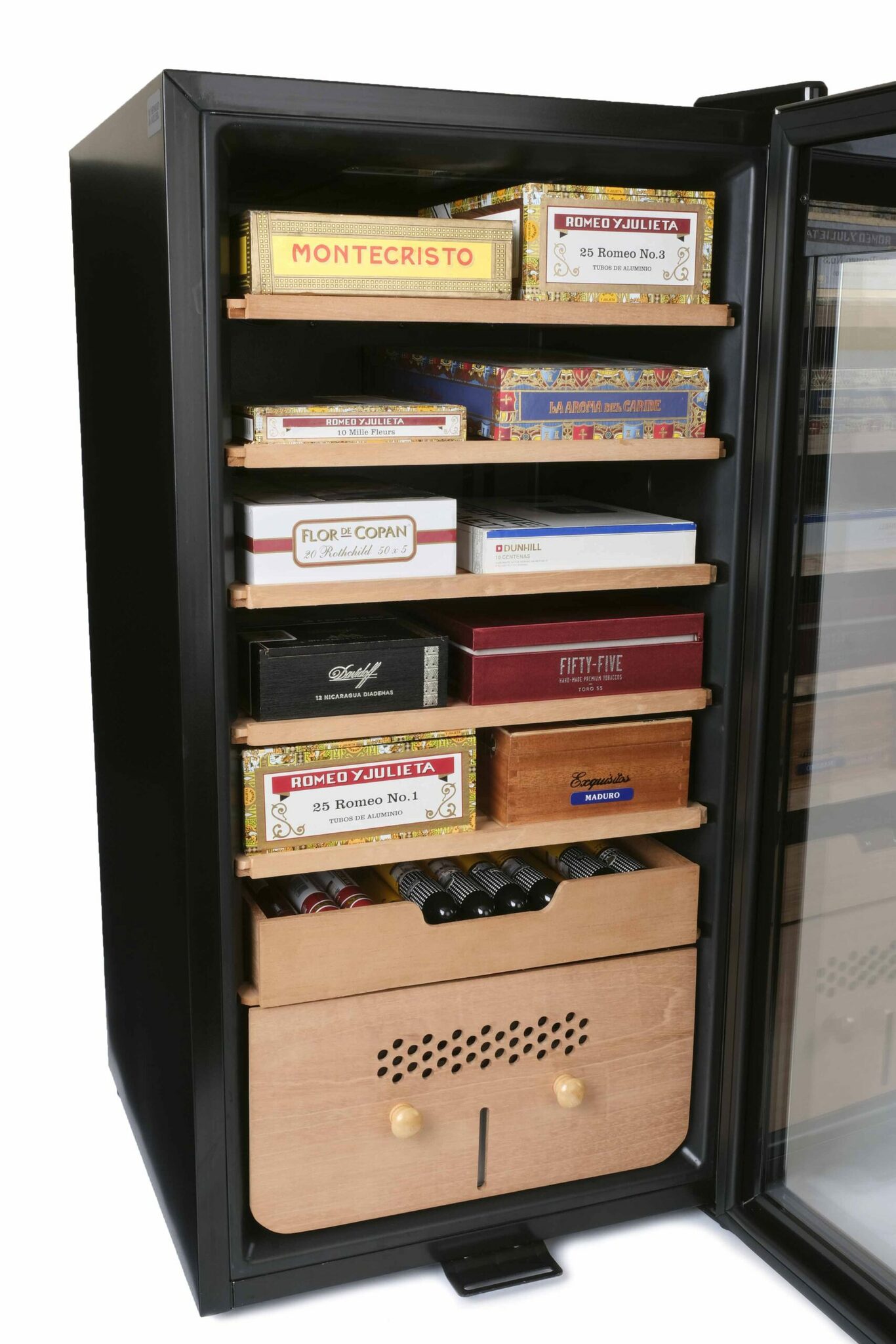 Новый компрессорный хьюмидор-шкаф Howard Miller с автоматическим блоком управления влажностью и функцией подогрева внутренней камеры при низких температурах в помещении (от +10С). Позволяет хранить до 600 сигар в комфортных климатических условиях с минимальным участием пользователя (большой лоток для воды на 2 литра требует долива примерно раз в 2 месяца эксплуатации). Внутри хьюмидора автоматически поддерживаются заданные пользователем температура и влажность, оптимальные для сохранения качества и вкуса сигар в течение длительного времени. Компрессорная система охлаждения (по сравнению с термоэлектрическими моделями) характеризуется большей мощностью и надежностью, а также позволяет использовать хьюмидор в расширенном диапазоне температур от +10С до +37C, т.е. не только дома или в офисе, но и в торговых, подвальных и иных помещениях с большими колебаниями температуры. Дверца из нержавеющей стали с антиультрафиолетовым стеклопакетом предохраняет содержимое от воздействия солнечного света. Имеется встроенный замок с ключом. Габаритные размеры (ШхГхВ): 430x450x840 мм. Размер упаковки (ШхГхВ): 502x525x885 мм. Внутренний объем / размеры камеры (ШхГхВ): 82(59) литра / 350х300х730(580) мм. Размер полок: 1 лоток из кедра 320х275 мм, 5 полок из кедра 345х275 мм. Масса нетто / с упаковкой: 23 кг / 25 кг. Вместимость до 600 сигар в зависимости от формата и индивидуальной упаковки (в коробках/тубах/поштучно/россыпью). Материал корпуса: эмалированная сталь, пластик (внутри). Материал дверцы: нержавеющая сталь, стеклопакет с УФ-защитой. Материал полок и лотков: испанский кедр. Номинальная потребляемая мощность 85 Ватт. Параметры электросети: 220-240 Вольт / 50-60 Герц. Условия эксплуатации: от +10 до +37 C. Управление температурой: температура задается на дисплее в диапазоне от +16 до +22С с шагом в 1 градус. Компрессорная система охлаждения с экологичным хладагентом R600a. Если температура в помещении ниже, чем в хьюмидоре (в диапазоне от +10 до +18 С), то автоматически включается блок подогрева для поддержания внутри заданной температуры от +18 до +22 С. Управление влажностью: устанавливается на дисплее в диапазоне 65-75% с шагом в 1%. Поддерживается автоматически отдельным электронным блоком с емкостью для дистиллированной воды на 2 литра, погружным увлажнителем и вентиляторами. Расход воды ~ одна заправка штатного лотка в 1-2 месяца. Уровень шума до 30 Дб (очень тихо). Подсветка белая, светодиодная. Возможности встраивания в мебель нет, для вентиляции необходимо минимум 10-15 см свободного пространства сзади и сбоку. Производитель оставляет за собой право без предварительного уведомления вносить незначительные изменения в конструкцию или комплектацию изделия с целью улучшения его свойств.