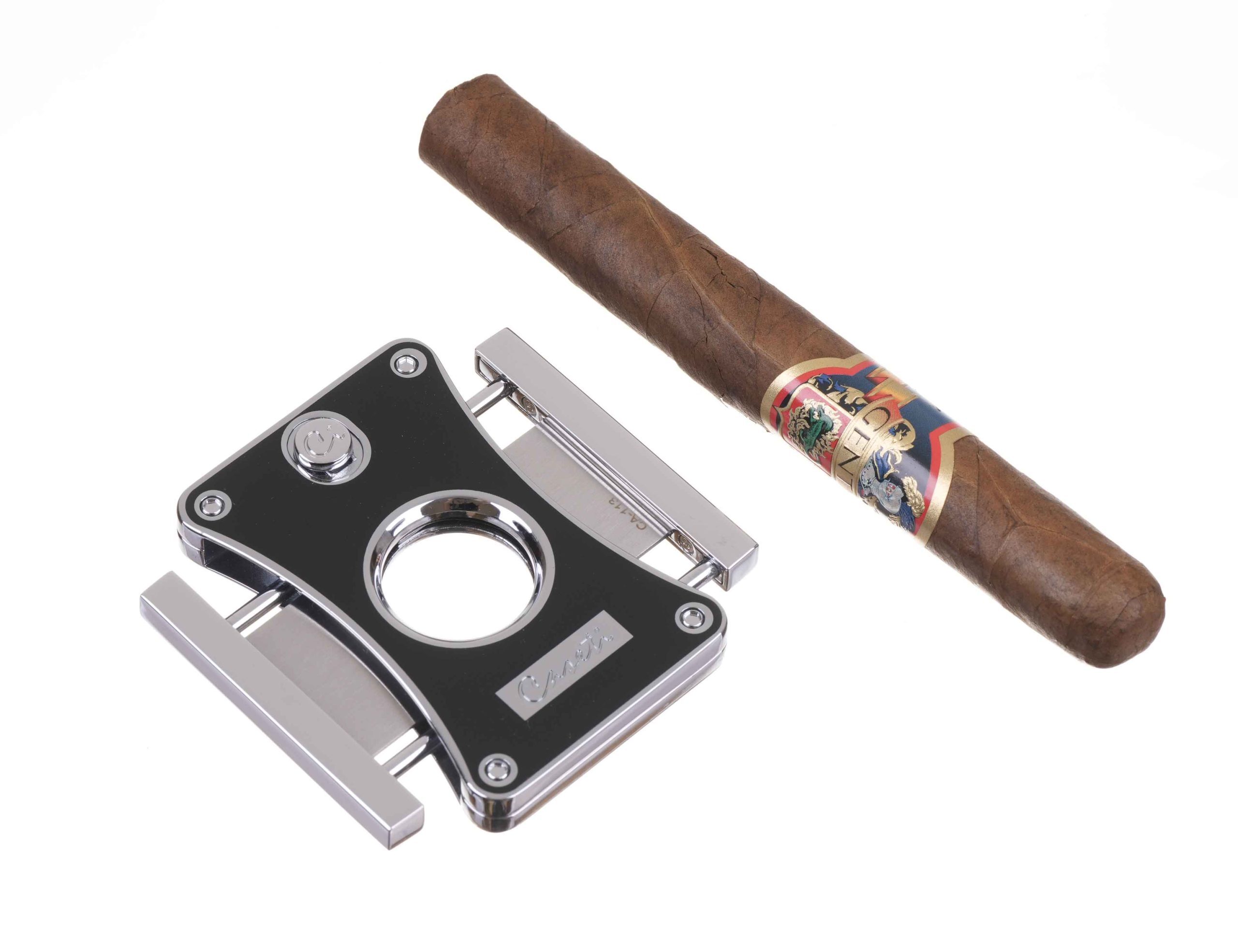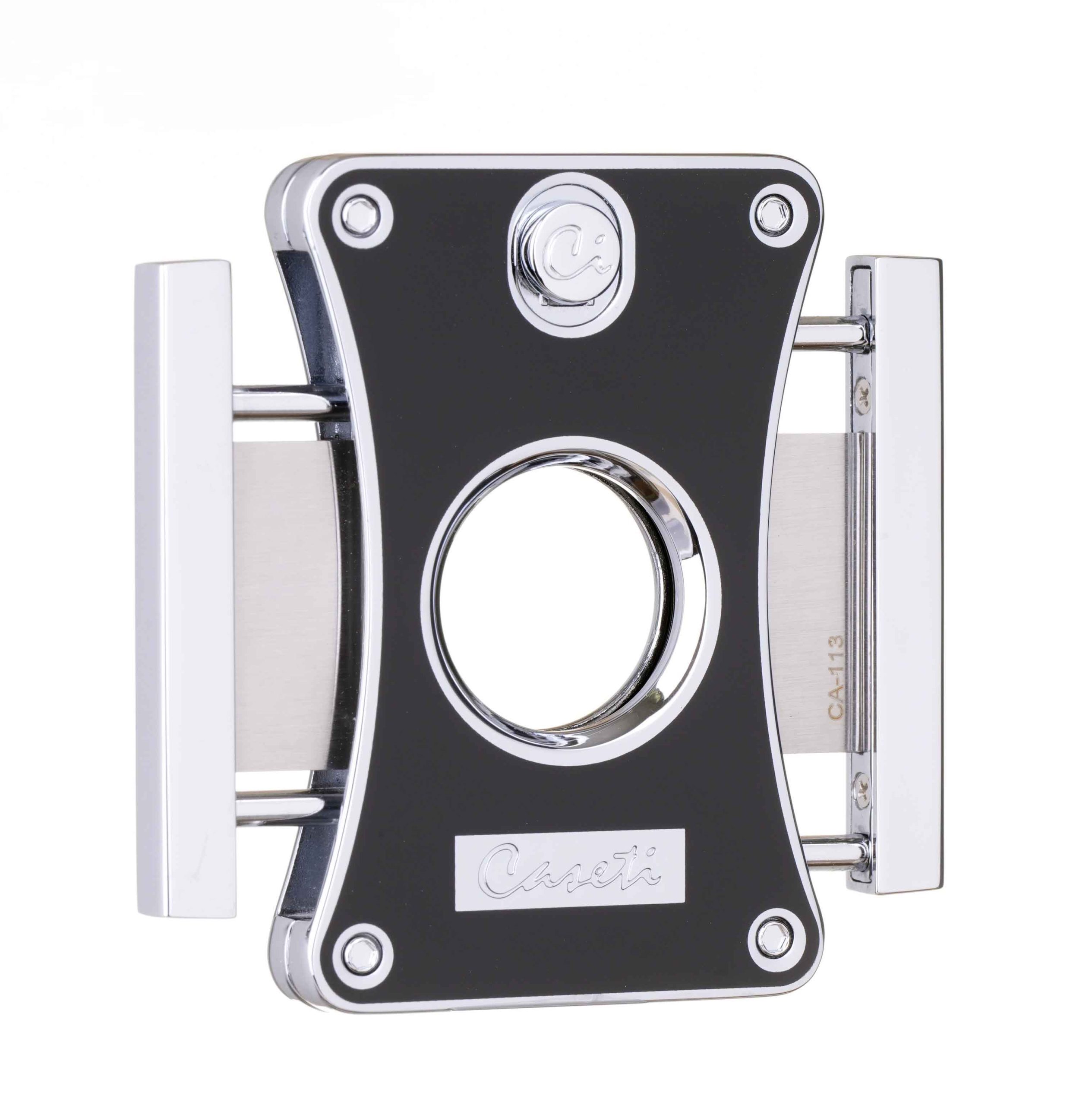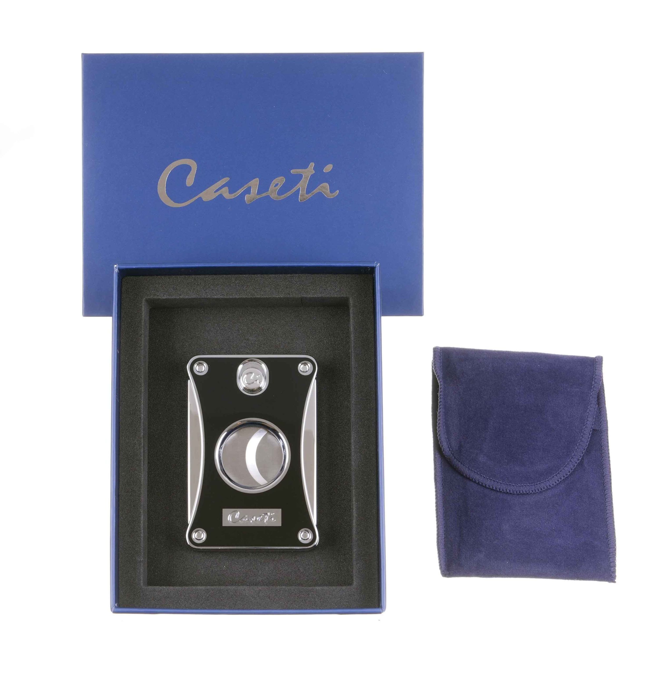 Сигарная гильотина от французского бренда Caseti. Действует по традиционному принципу гильотин — двойное лезвие в металлическом корпусе раскрывается пластинчатой пружиной при нажатии на кнопку. Для сигар диаметром до 21 мм. Фирменная подарочная коробка.