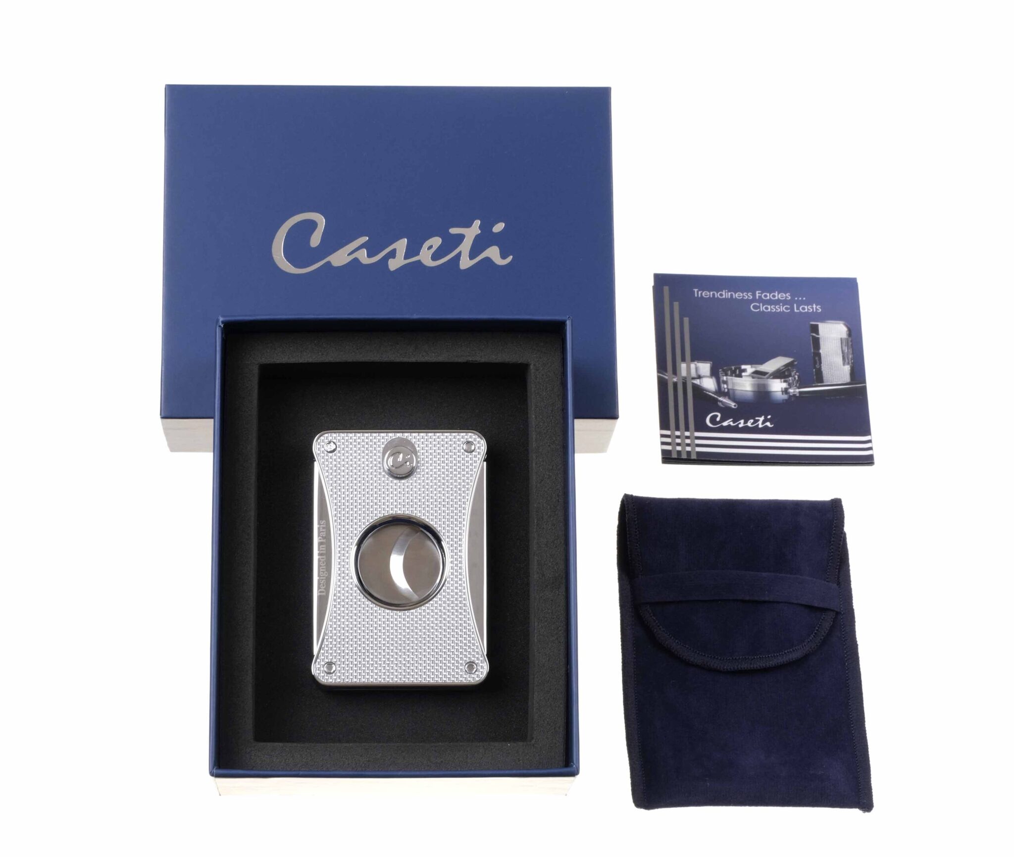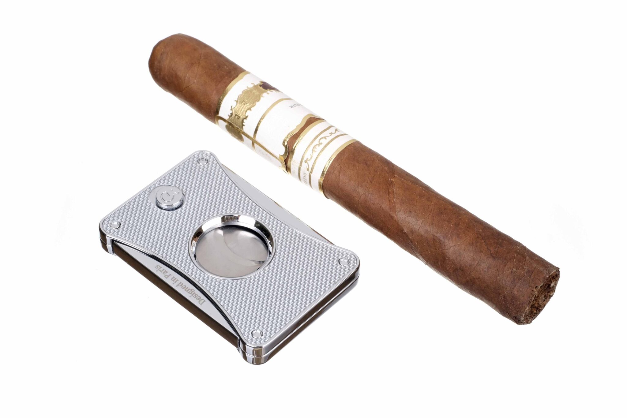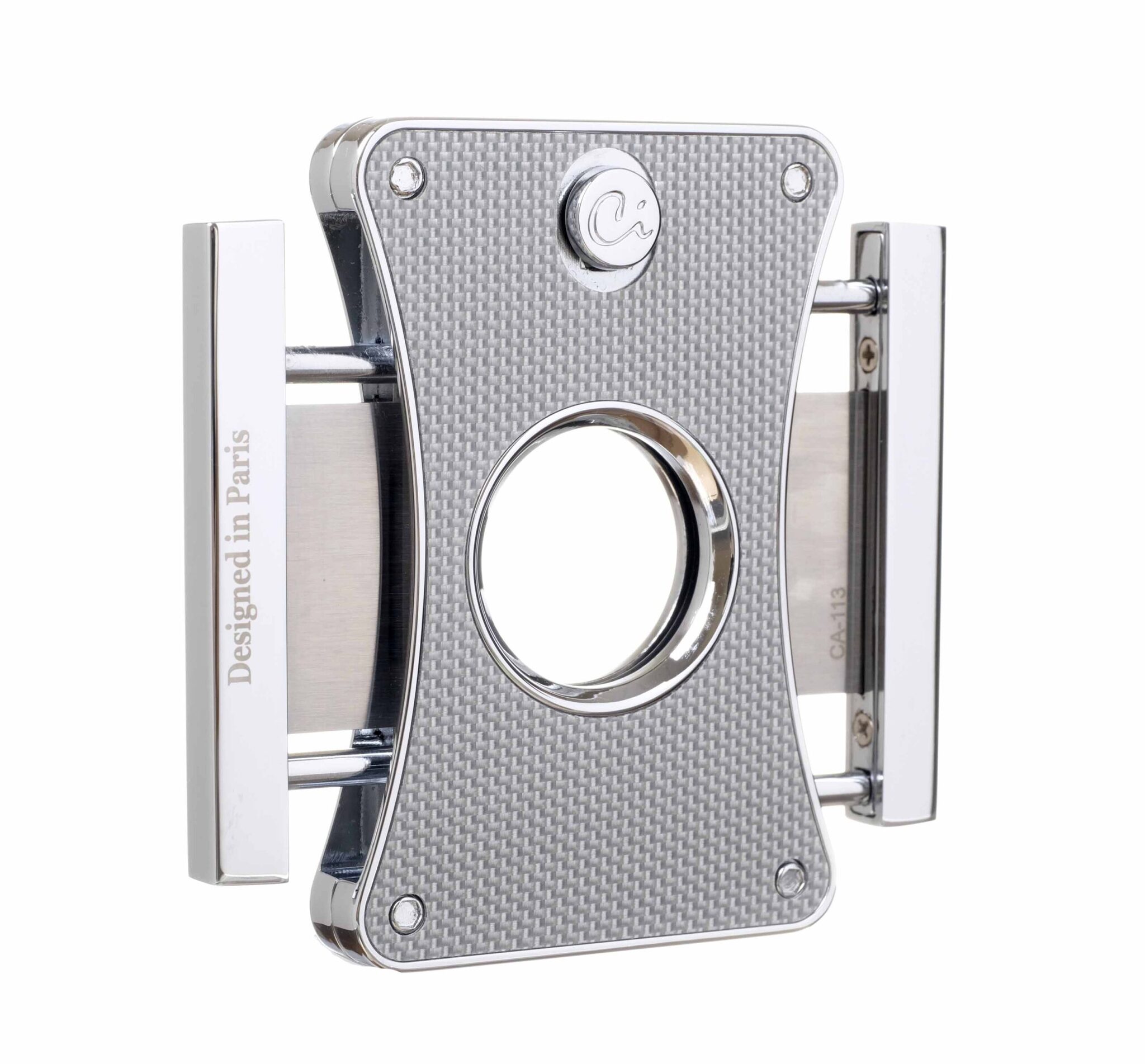 Действует по традиционному принципу гильотин — двойное лезвие в металлическом корпусе раскрывается пластинчатой пружиной при нажатии на кнопку. Для сигар диаметром до 21 мм. Фирменная подарочная коробка.