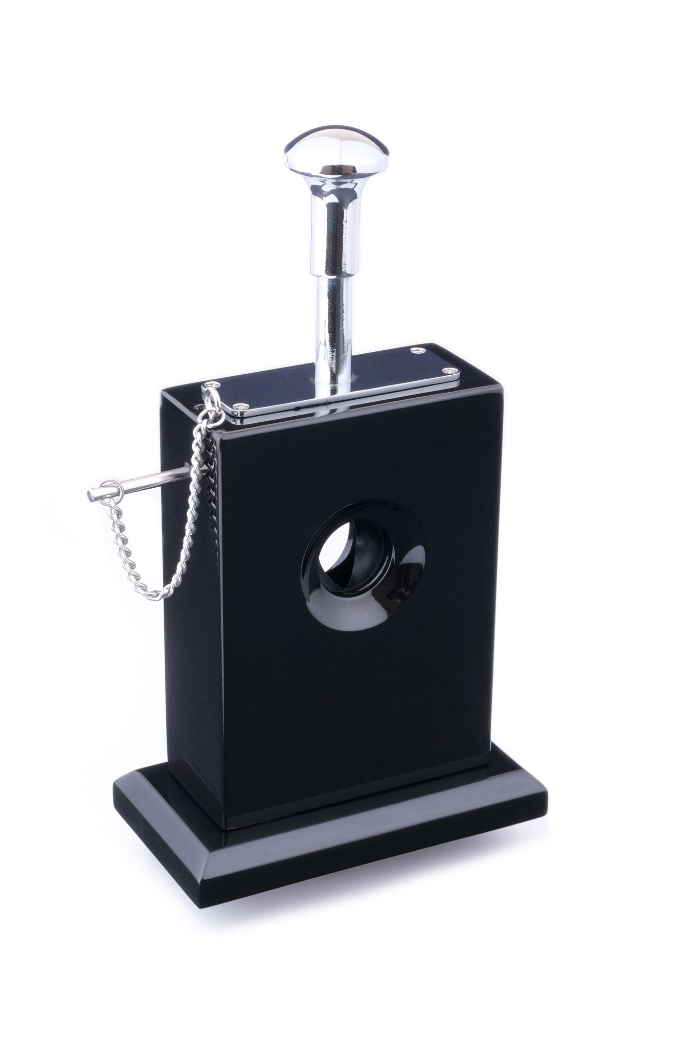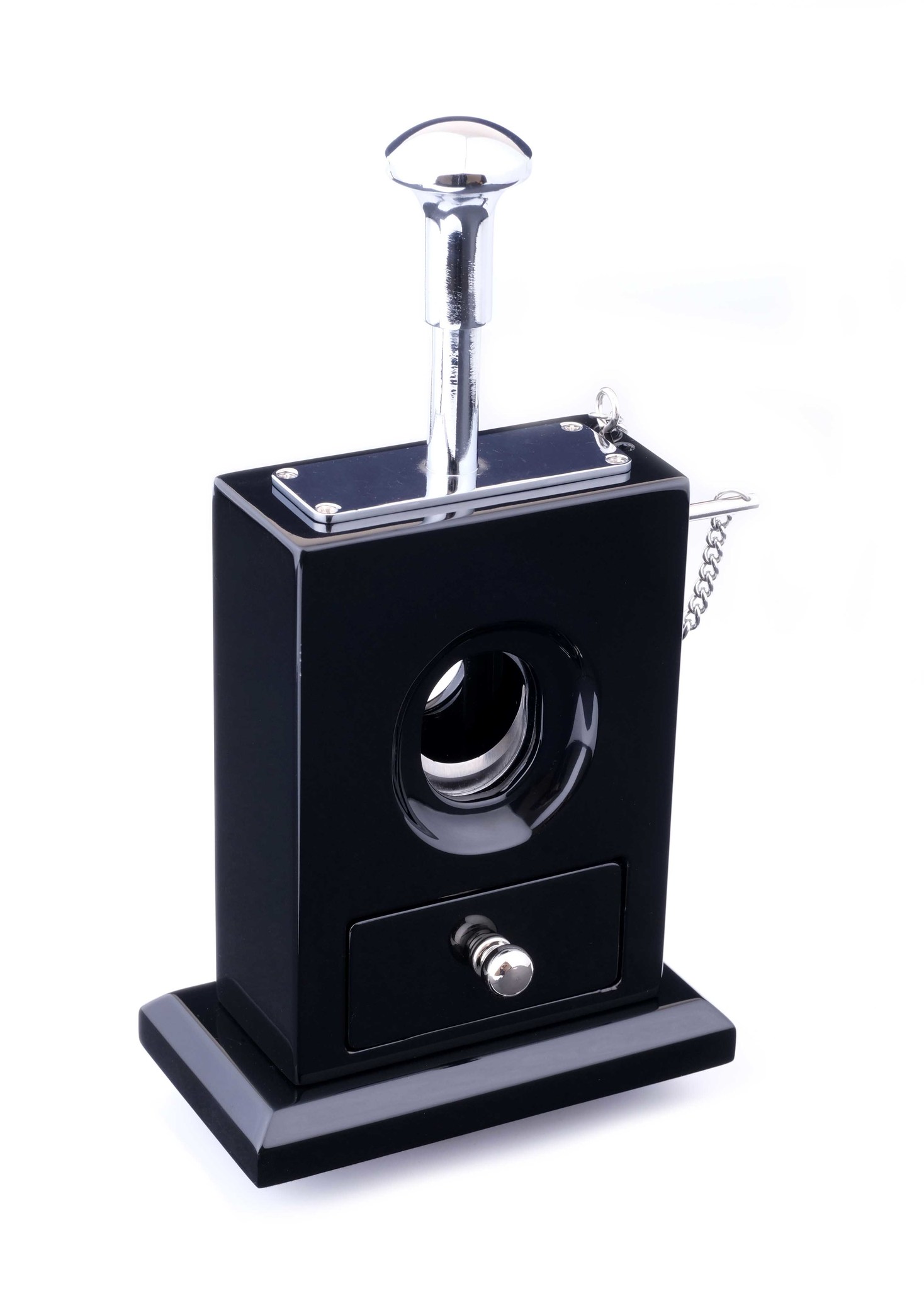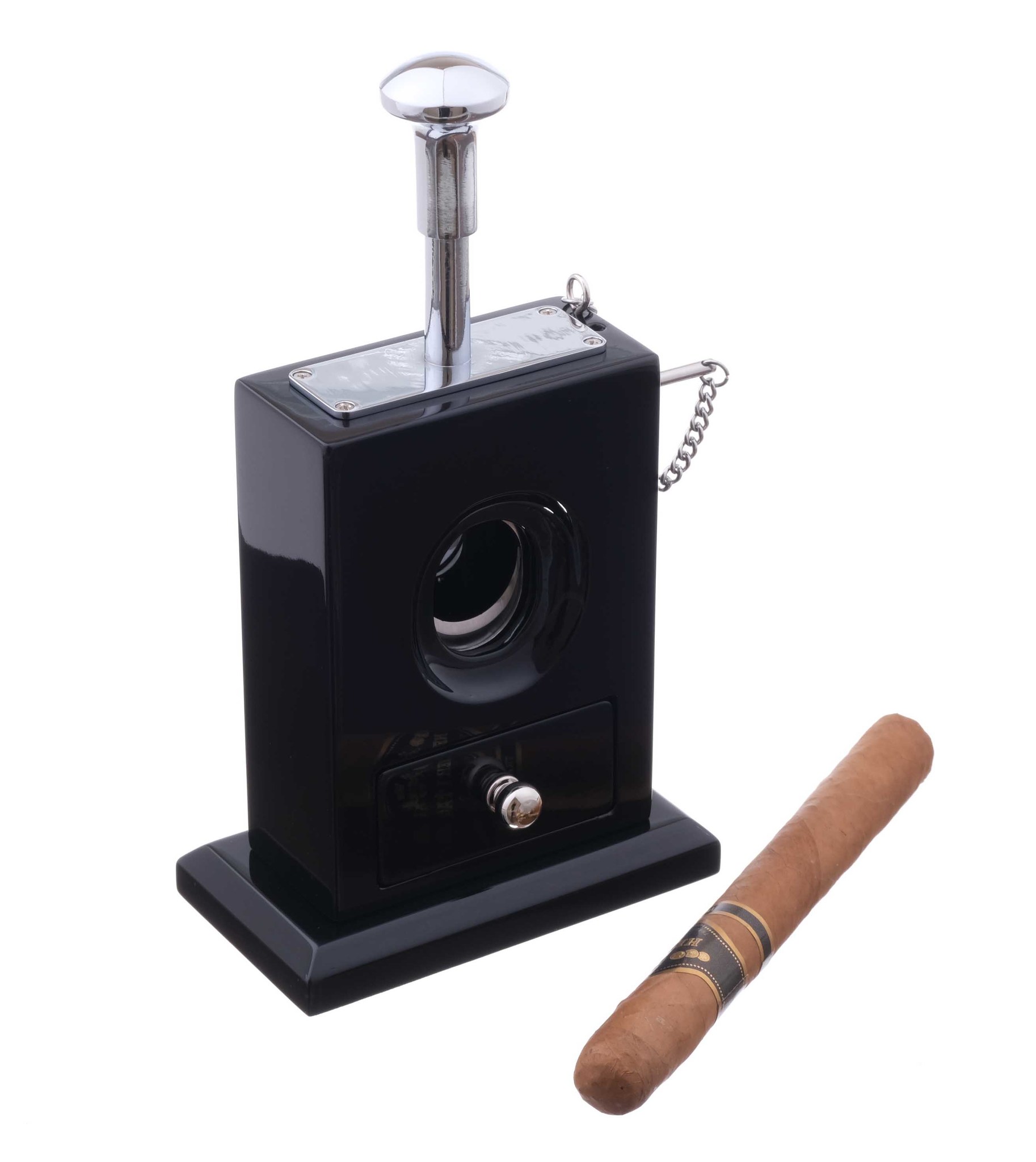 Для безопасности сбоку имеется стержневой стопор-предохранитель. Обрезанная сигарная шапочка падает внутрь корпуса в съемный лоток. Прекрасный сигарный аксессуар, который может быть как самостоятельным предметом интерьера, так и гармоничным дополнением к хьюмидору и/или настольной пепельнице.