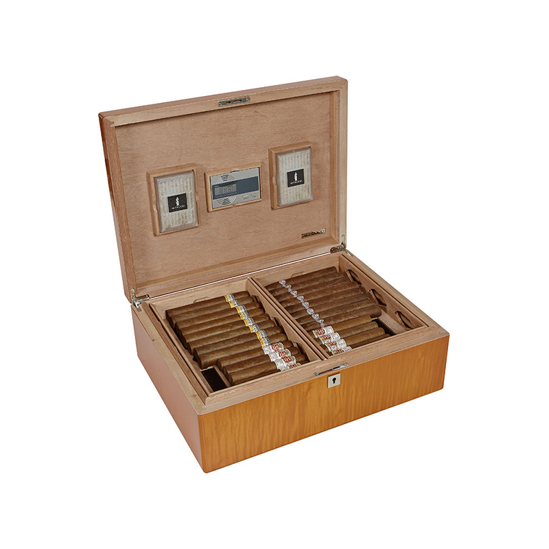 Хьюмидор Artwood Escuero на 125 сигар выполнен из средиземноморского кедра, внешняя отделка - древесина боливийского ореха (Escuero). Эта древесина используется для декоративной отделки, она плотная и прочная, хорошо поддается механической обработке, полированию. Цветовая гамма имеет переход от бледно-коричневого цвета к интенсивному багровому в зависимости от возраста дерева . Хьюмидор оснащен электронным датчиком влажности и температуры и двумя увлажнителями последнего поколения со специальными кристаллами. Поддерживая идеальную влажность, кристаллы уменьшаются в объеме, сигнализируя о необходимости заправить увлажнитель жидкостью.