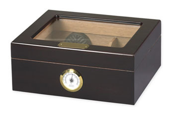 Небольшой хьюмидор с гигрометром и увлажнителем. Верхняя крышка со стеклом и наружний гигрометр позволяют контролировать состояние сигар, не открывая лишний раз хьюмидор. Отделка под махагон. Прекрасно подойдёт для начинающих любителей сигар.