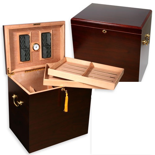 Великолепный хьюмидор особо большой вместимости. В нём легко можно разместить более 250 сигар (сигар малых форматов более 300). В комплект входят 2 увлажнителя, благодаря которым в хьюмидоре поддерживается необходимый уровень влажности, при которой сигары догое время сохраняют свой вкус и аромат. Контроль влажности осуществляется аналоговым гигрометром. Также в комплекте идут два лотка из испанского кедра с разделителями.