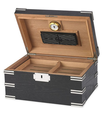 Хьюмидор современного мужского дизайна с металлическими вставками. В комплекте поставляется съёмный лоток из кедра, гигрометр, увлажнитель. Хьюмидор запирается на замок.