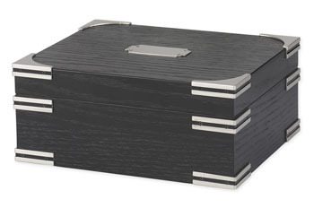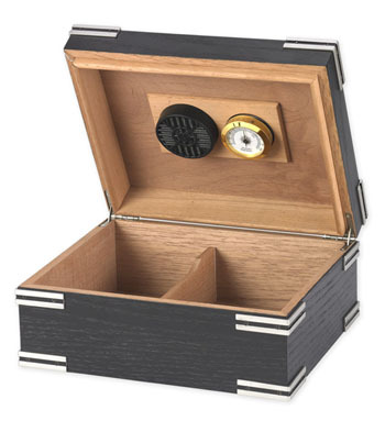 Хьюмидор современного мужского дизайна с металлическими вставками. В комплекте поставляется разделитель из кедра, гигрометр, увлажнитель.