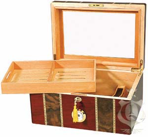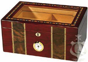 Хьюмидор со стеклом, позволяющим видеть всё содержимое и наружним гигрометром. Это исключает необходимость часто открывать его для проверки своих сигар. Отделка - вишня со вставками ореха. В комплекте поставляется съёмный лоток из кедра, увлажнитель. Хьюмидор запирается на замок.