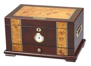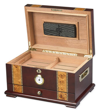 Прекрасный большой хьюмидор с элегантной палисандровой отделкой и вставками клёна. В хьюмидоре предусмотрен наружнее отделение для аксессуаров. По бокам расположены ручки-выемки для удобства перемещения. В комплекте поставляется съёмный лоток из кедра, гигрометр, увлажнитель. Хьюмидор запирается на замок.