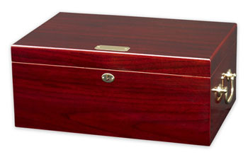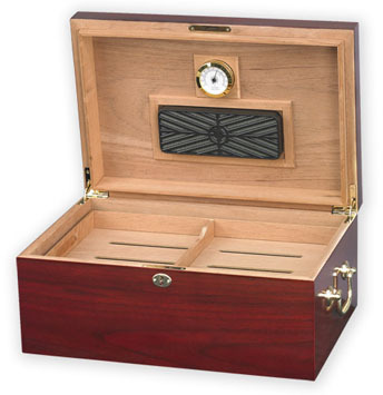 Отличный хьюмидор вместимостью до 120 сигар. Имеет дополнительный лоток с разделителем из испанского кедра. Внутри отделан испанским кедром. Снаружи - полированный с отделкой под вишнёвое дерево и блестяшими удобными ручками по бокам.