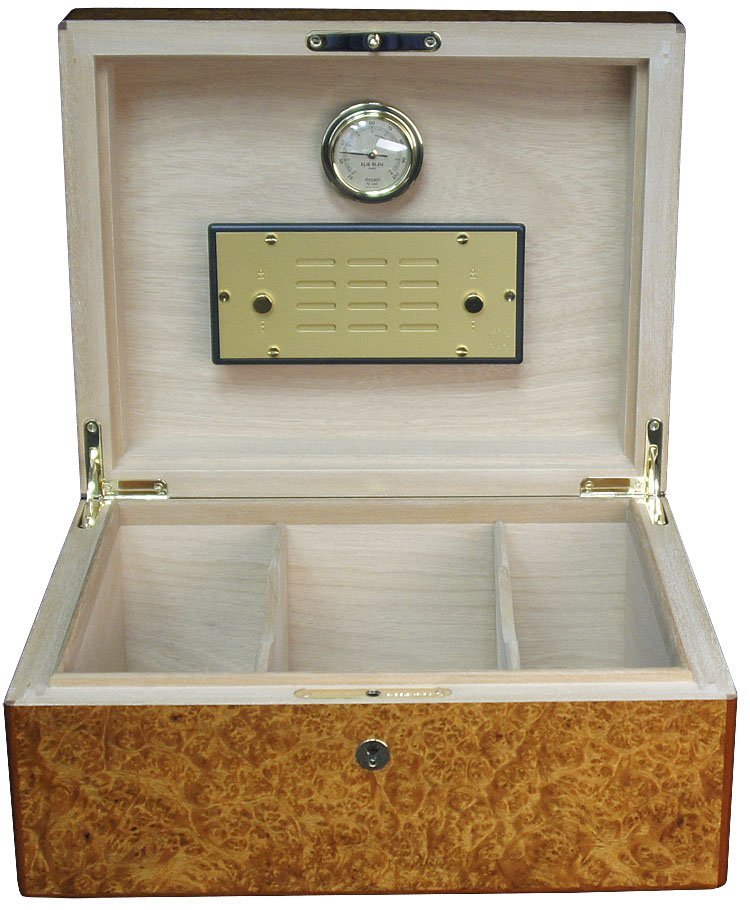 Комплектация – внутренний аналоговый гигрометр, 1 увлажнитель, съемный разделитель для сигар, ключ.