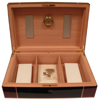 Комплектация – гигрометр, 2 увлажнителя, съемный разделитель для сигар, ключ.