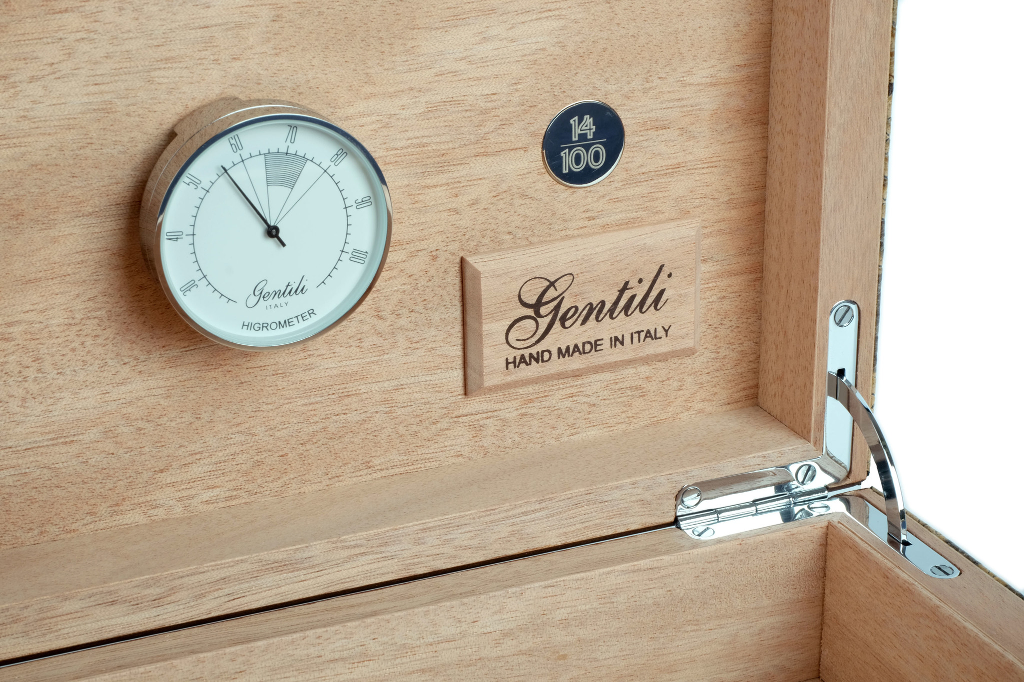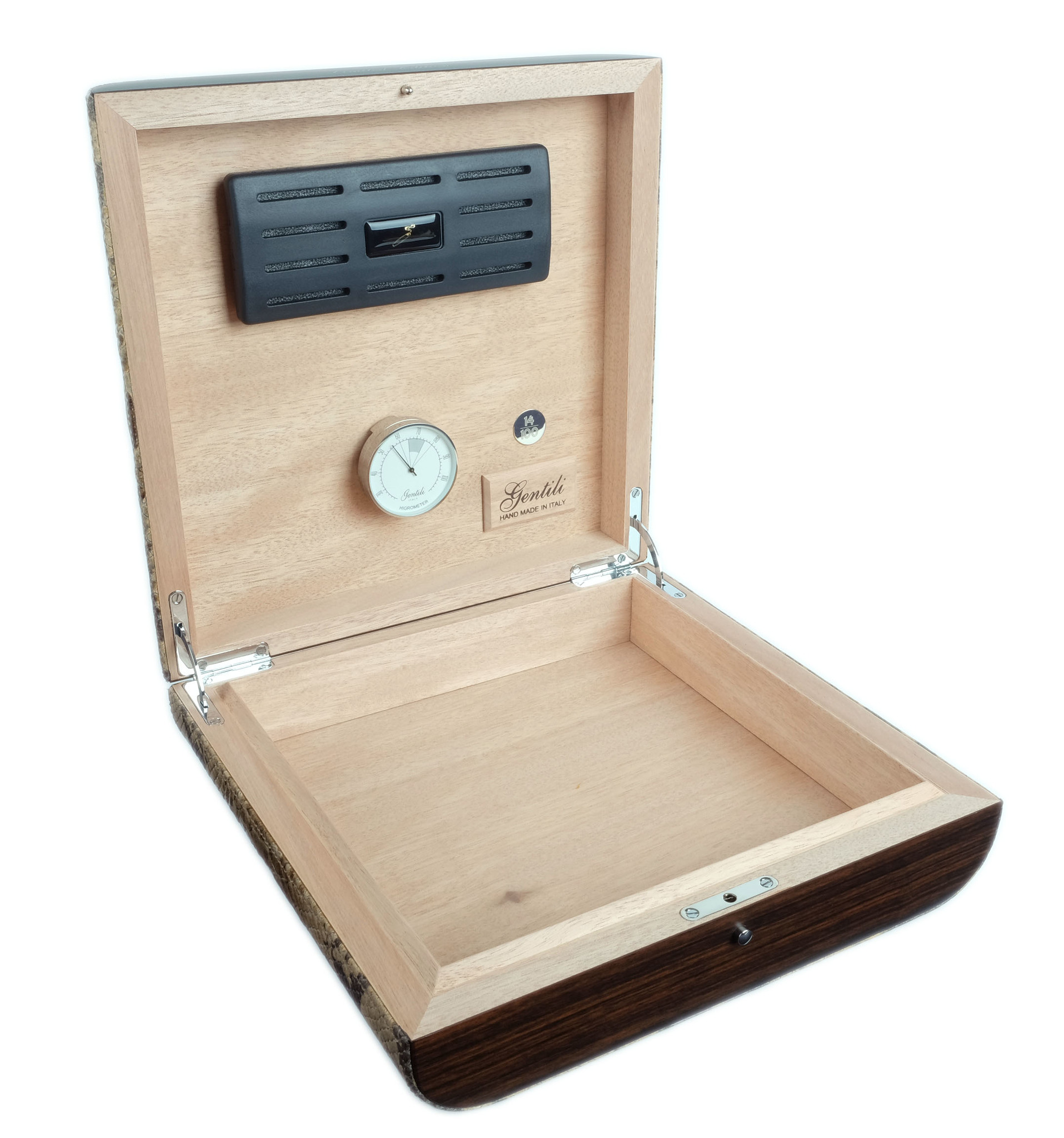 Исполнен в классическом итальянском стиле — элегантное сочетание лучших материалов в единое целое: дерева, кожи, металла. Корпус представляет собой комбинацию нескольких видов дерева, что обеспечивает стойкость к деформации при колебаниях температуры и влажности. Внутренняя отделка выполнена из испанского кедра. Снаружи — шпон Эбенового дерева из Индонезии, покрытый 7-ю слоями лака, а также натуральная телячья кожа с тиснением и лакировкой. На внутренней стороне крышки — табличка с порядковым номером изделия в серии из 100 шт. В комплекте увлажнитель с акриловым полимером, итальянский гигрометр, фирменный буклет Gentili с информацией о компании и мультиязычной инструкцией по уходу. Подарочная упаковка.