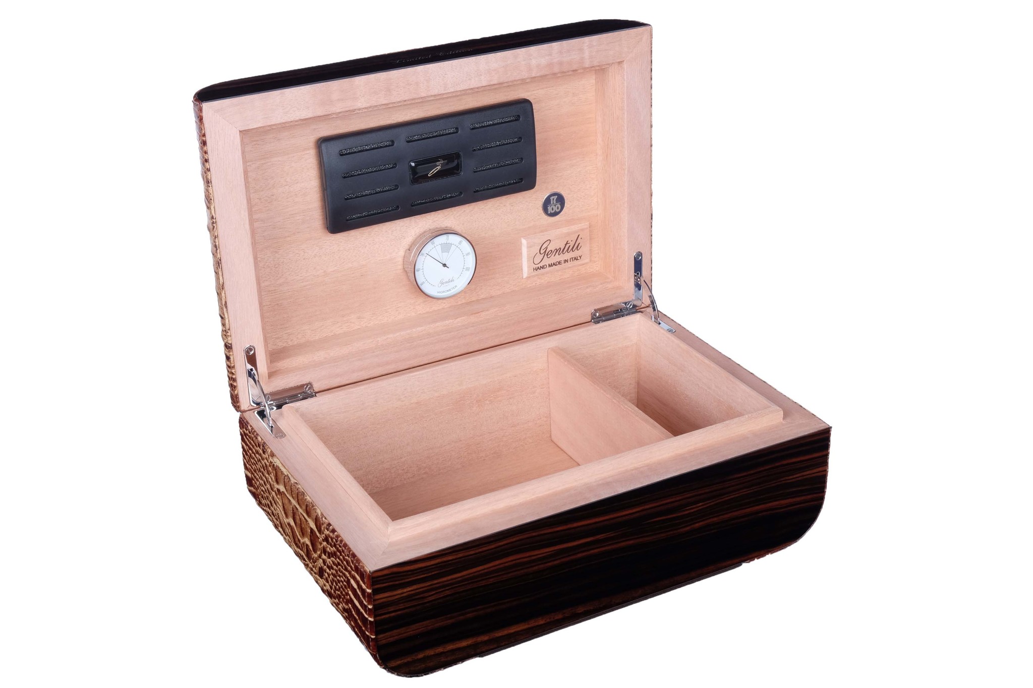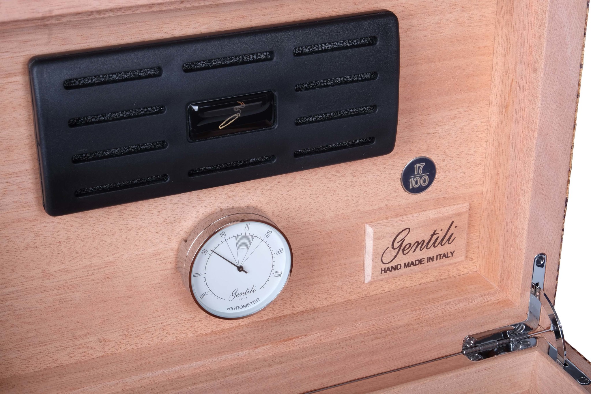 Хьюмидор ручной работы на 30-40 сигар. Ограниченная серия (100 шт). В комплекте увлажнитель с акриловым полимером, итальянский гигрометр, фирменный буклет Gentili с информацией о компании и мультиязычной инструкцией по уходу. Подарочная коробка.