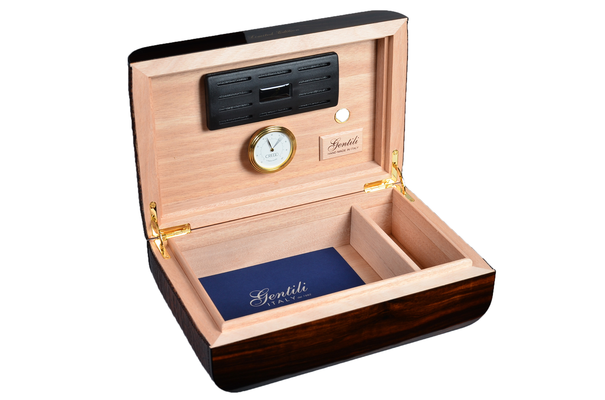 Хьюмидор ручной работы на 30-40 сигар. Ограниченная серия (100 шт). В комплекте увлажнитель с акриловым полимером, итальянский гигрометр, фирменный буклет Gentili с информацией о компании и мультиязычной инструкцией по уходу. Подарочная коробка.