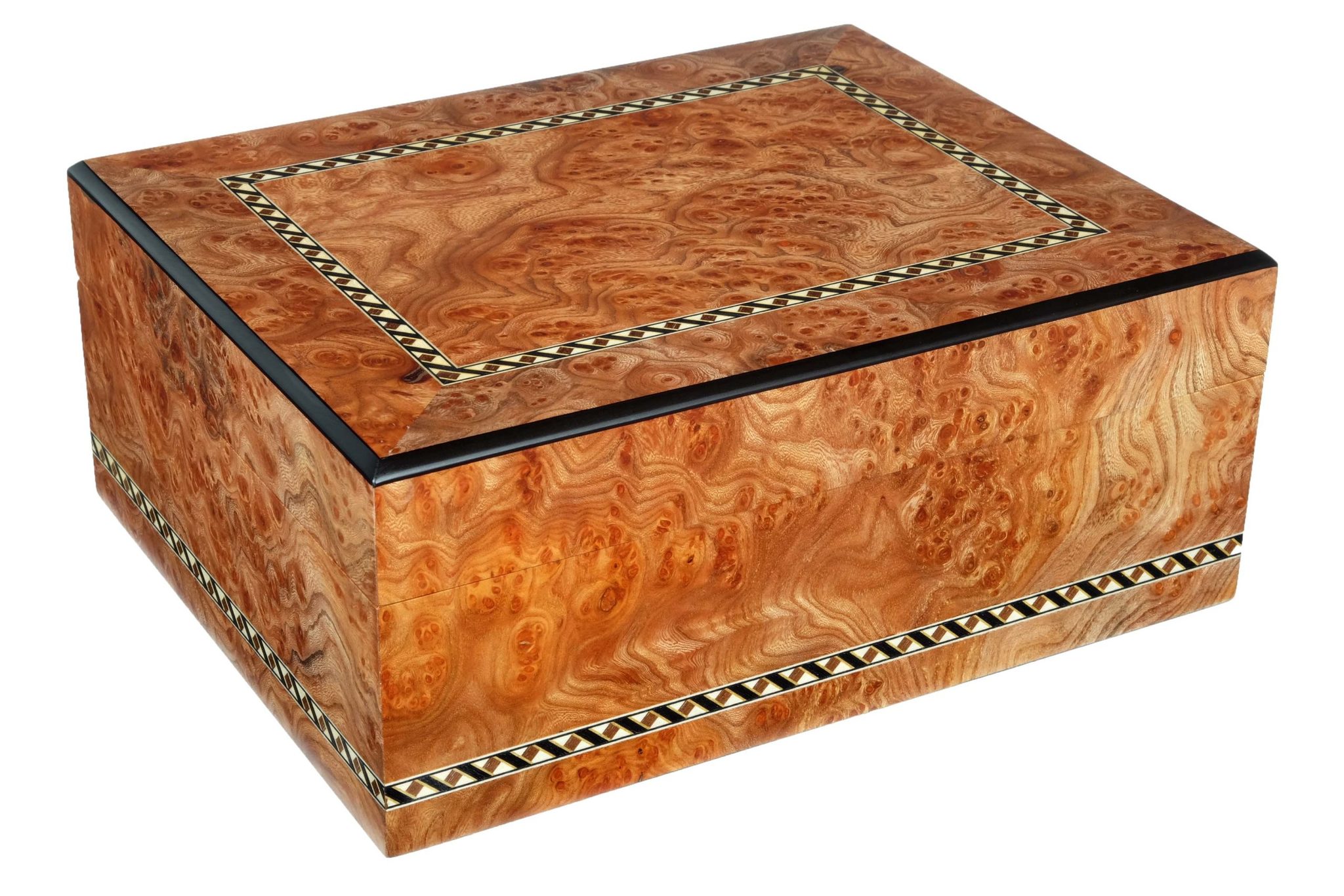 Хьюмидор премиум-класса на 50 сигар от итальянских мастеров фабрики Fabrizio Gentili SRL. Модель характеризуется классическим дизайном и безупречностью в исполнении всех элементов. Корпус представляет собой комбинацию нескольких видов дерева, что обеспечивает стойкость к деформации при колебаниях температуры и влажности. Внутренняя отделка выполнена из высококачественного испанского кедра. Снаружи — шпон корнекапа Вяза Европейского (редкий и красивый материал с уникальным рисунком в виде кружева или «птичьего глаза», получаемый из прикорневых наростов), покрытый многослойным матовым лаком. Крышка украшена орнаментом-инкрустацией из кусочков ценной древесины по технологии «Маркетри». В комплекте с хьюмидором идут увлажнитель с акриловым полимером последнего поколения, высокоточный откалиброванный итальянский гигрометр, фирменный буклет Gentili с информацией о компании и мультиязычной инструкцией по уходу. Подарочная упаковка. Ручная работа, сделано в Италии. Официальный сайт производителя: https://www.gentili-italy.com.