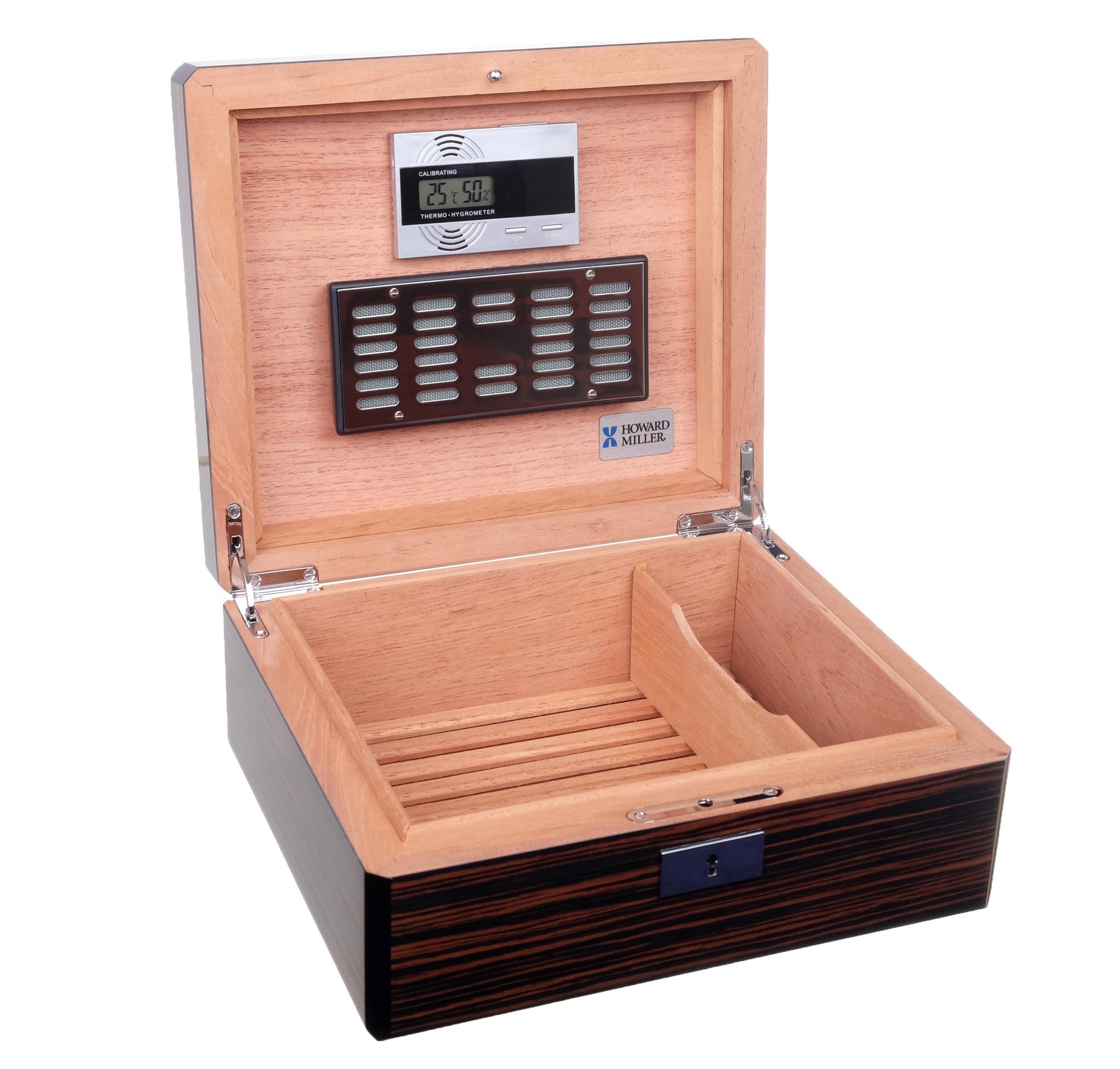 Хьюмидор премиум-классана jn американской компании HOWARD MILLER — известного производителя предметов интерьера. Массивное изделие со строгим классическим дизайном и качественным исполнением. Корпус отделан шпоном Эбенового дерева (Ebony) из Экваториальной Африки и покрыт глянцевым лаком. Внутренняя отделка из Испанского кедра. На дне — съемная кедровая решетка для равномерного увлажнения сигар и вентиляции по всему объему. Тканевый чехол и подарочная коробка.