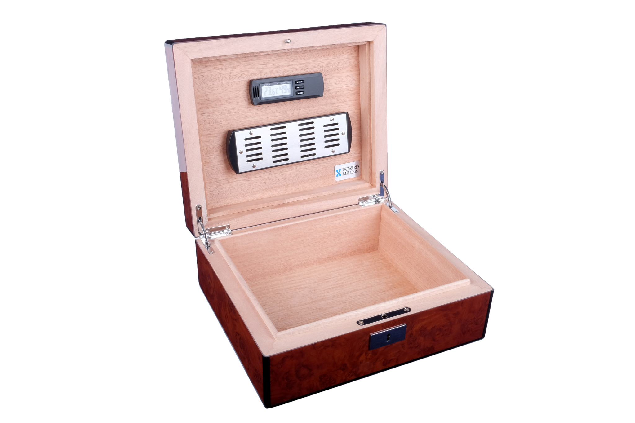 Массивное изделие со строгим классическим дизайном и качественным исполнением. Внутренняя отделка из Испанского кедра. Корпус отделан Красным деревом и многослойным глянцевым лаком. В комплекте с хьюмидором HOWARD MILLER идут увлажнитель с акриловым полимером и регулируемый электронный термогигрометр, которые крепятся в любом месте на крышке, благодаря скрытой под кедровым шпоном магнитной пластине. Замок с ключом, подробная инструкция по эксплуатации. Тканевый чехол и подарочная коробка.