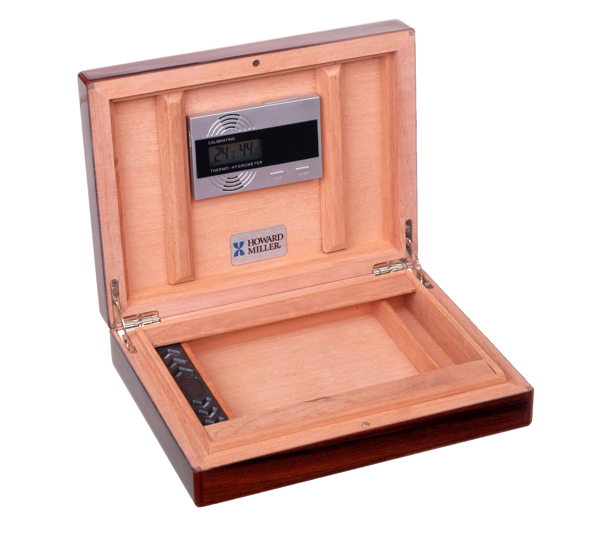 Внутренняя отделка из Испанского кедра. Корпус отделан ценным шпоном Бразильского Розового дерева (Bahia Rosewood) и покрыт глянцевым лаком. В комплекте с хьюмидором HOWARD MILLER идут увлажнитель, электронный термогигрометр, 2 продольных и 2 поперечных перегородки для сигар, подробная инструкция по эксплуатации. Тканевый чехол и подарочная коробка.