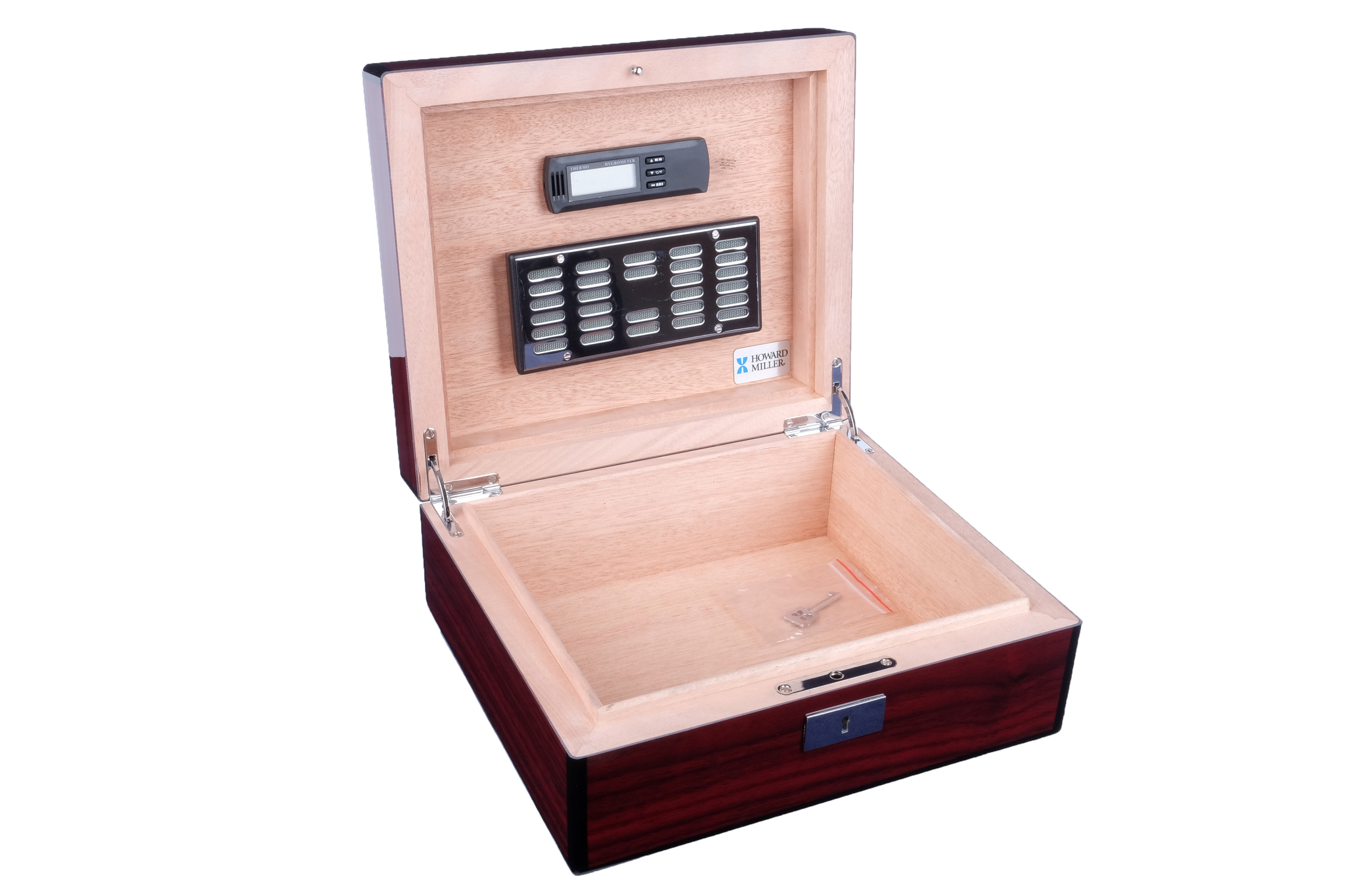 Массивное изделие со строгим классическим дизайном и качественным исполнением. Внутренняя отделка из Испанского кедра. Корпус отделан тонированным шпоном Вишни Американской (Black cherry) и многослойным глянцевым лаком. В комплекте с хьюмидором HOWARD MILLER идут увлажнитель с акриловым полимером и регулируемый электронный термогигрометр, которые крепятся в любом месте на крышке, благодаря скрытой под кедровым шпоном магнитной пластине. Замок с ключом, подробная инструкция по эксплуатации. Тканевый чехол и подарочная коробка.