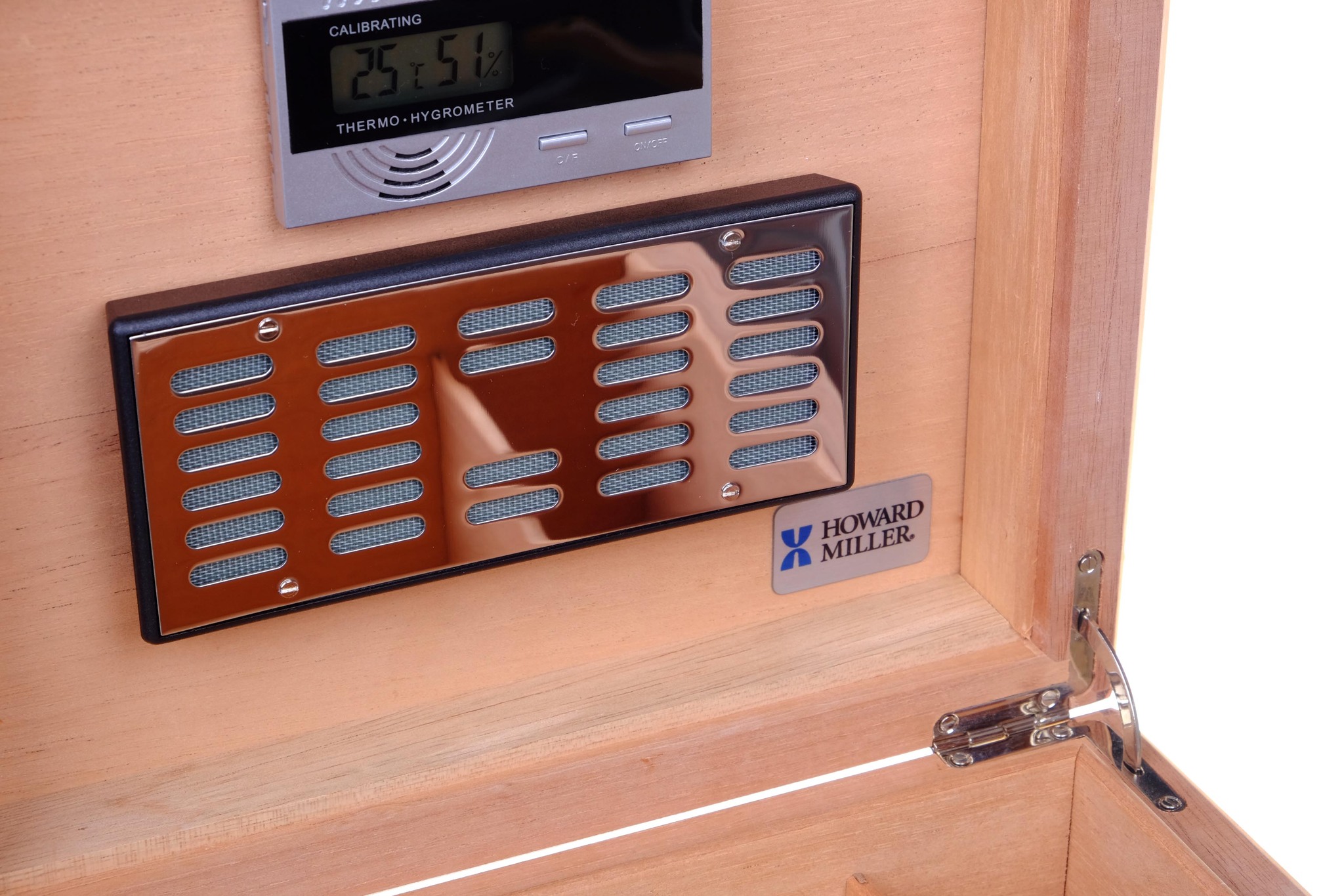 На дне съемная кедровая решетка для равномерного увлажнения сигар и вентиляции по всему объему. В комплекте увлажнитель с биогубкой, электронный термогигрометр, замок с ключом, инструкция по уходу. Тканевый чехол и подарочная коробка.