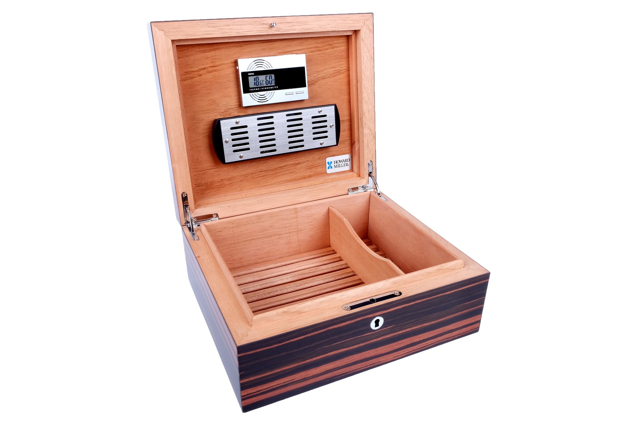 Массивное изделие со строгим классическим дизайном и качественным исполнением. Корпус отделан шпоном Желтого Эбенового дерева (Yellow Ebony) из Экваториальной Африки и покрыт глянцевым лаком. Внутренняя отделка из Испанского кедра. На дне — съемная кедровая решетка для равномерного увлажнения сигар и вентиляции по всему объему. В комплекте с хьюмидором HOWARD MILLER идут увлажнитель с акриловым полимером, электронный термогигрометр, замок с ключом, подробная инструкция по эксплуатации. Тканевый чехол и подарочная коробка. Для настольного сигарного набора идеально сочетается с пепельницей HOWARD MILLER арт. 810-065 и настольной турбозажигалкой HOWARD MILLER арт. 810-075 в корпусе из того же дерева.