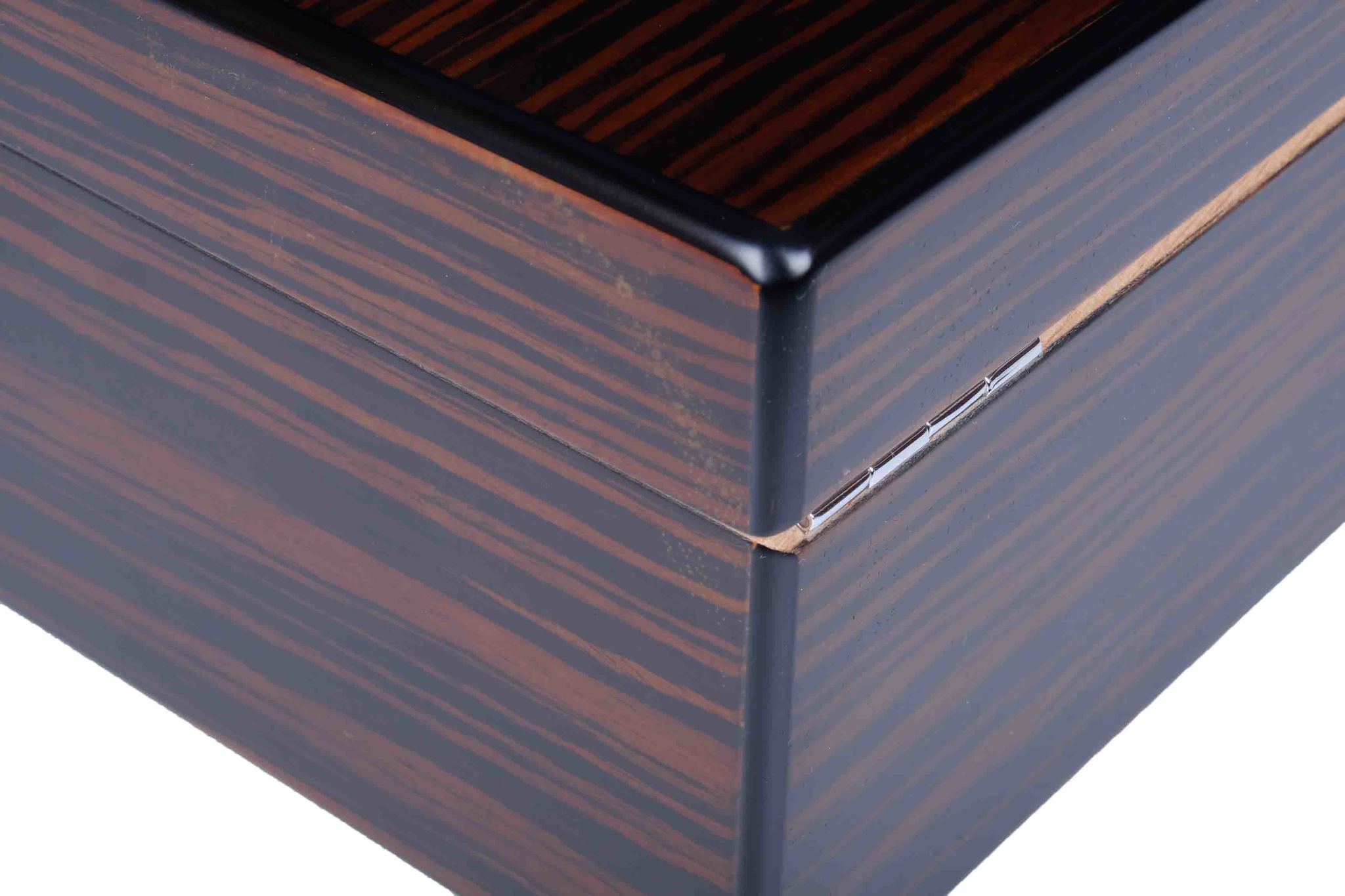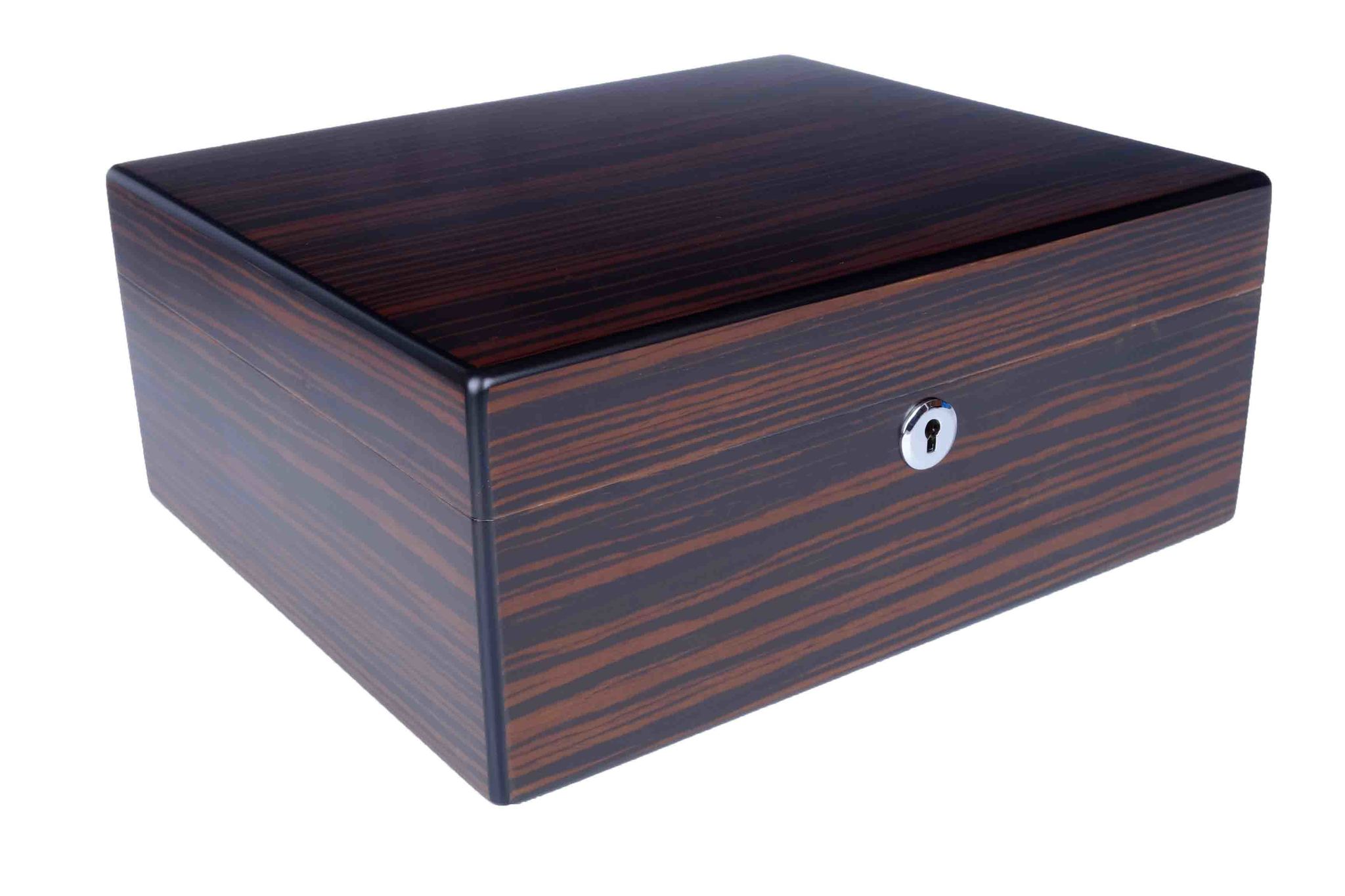 Массивное изделие со строгим классическим дизайном и качественным исполнением всех деталей. Внутренняя отделка из Испанского кедра. На дне — съемная кедровая решетка для равномерного увлажнения сигар и вентиляции по всему объему. Корпус отделан ценным шпоном Эбенового дерева (Макассар индонезийский). Матовая лакировка подчеркивает красоту дерева. В комплекте увлажнитель с биогубкой и гигрометр, которые крепятся в любом месте на крышке, благодаря скрытой под кедровым шпоном магнитной пластине. Замок с ключом, подробная инструкция по эксплуатации. Тканевый чехол и подарочная коробка.