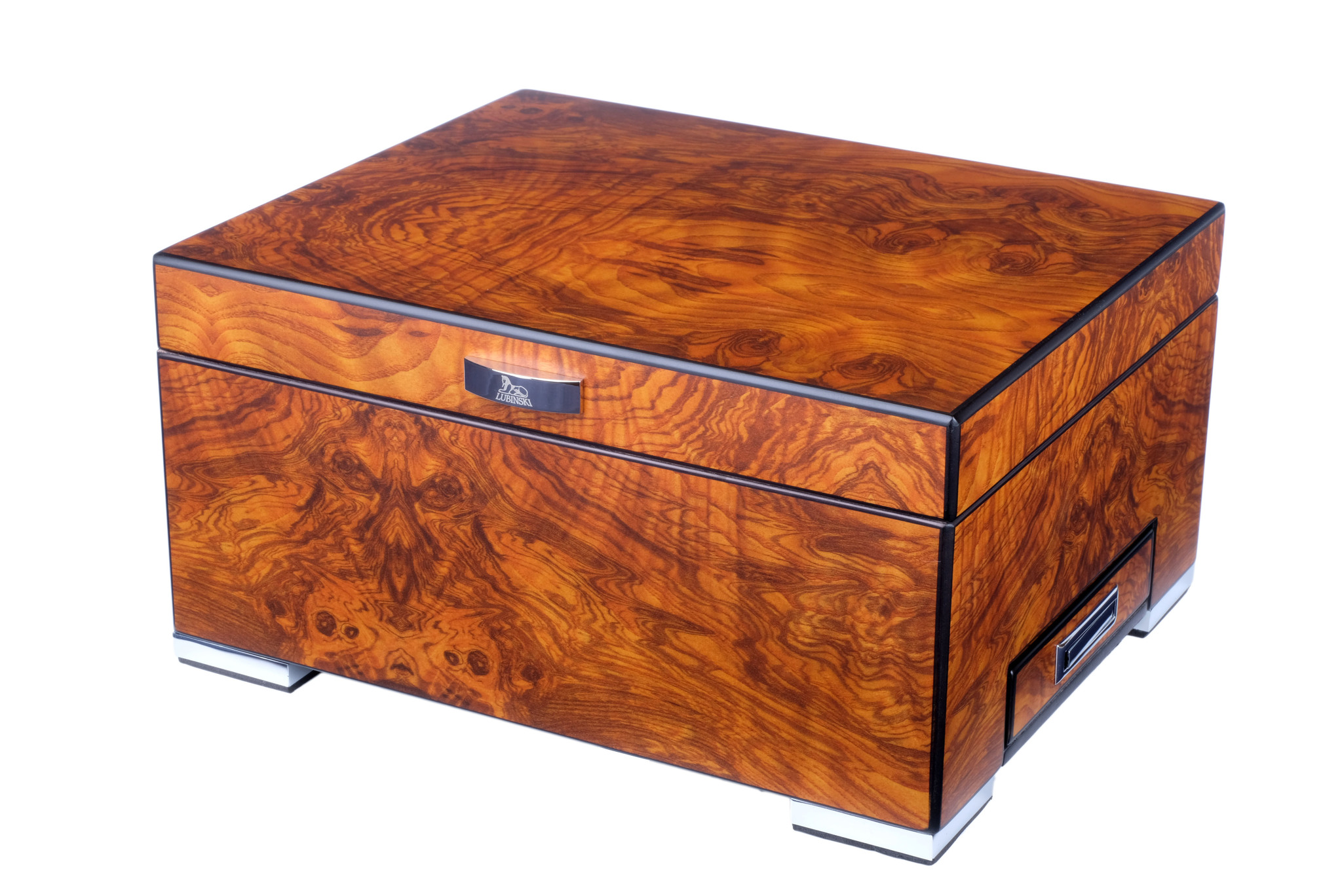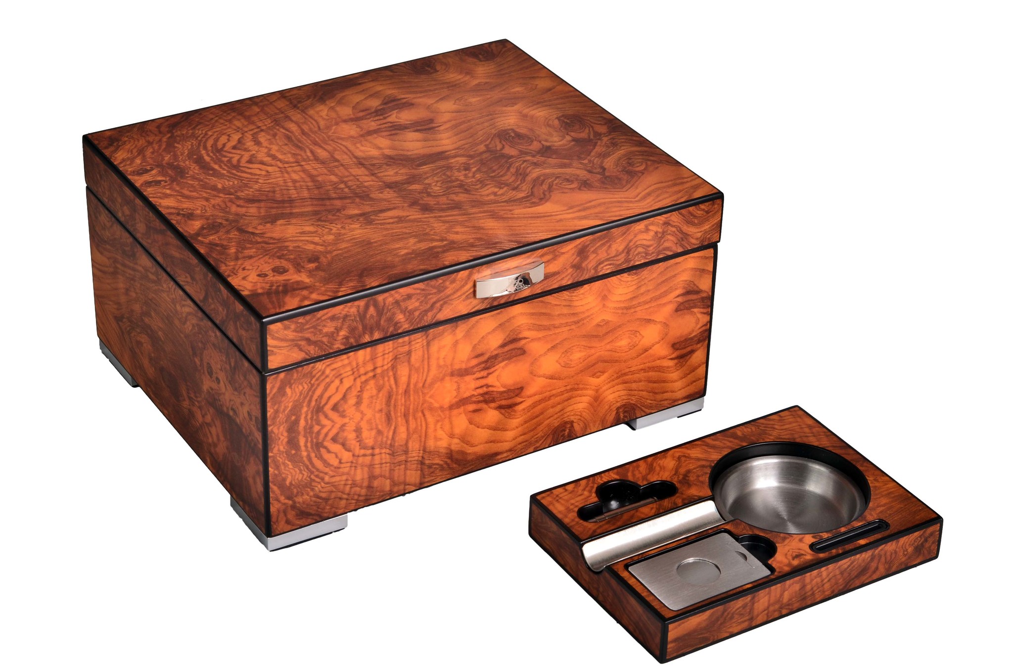 Хьюмидор на 25 сигар в наборе с пепельницей, пробойником и гильотиной от итальянской компании Lubinski. Внутренняя отделка выполнена из испанского кедра, произрастающего в Латинской Америке. В комплекте электронный термогигрометр с функцией калибровки и увлажнитель с акриловым полимером нового поколения. Подробная инструкция по эксплуатации прилагается. Подарочная коробка.