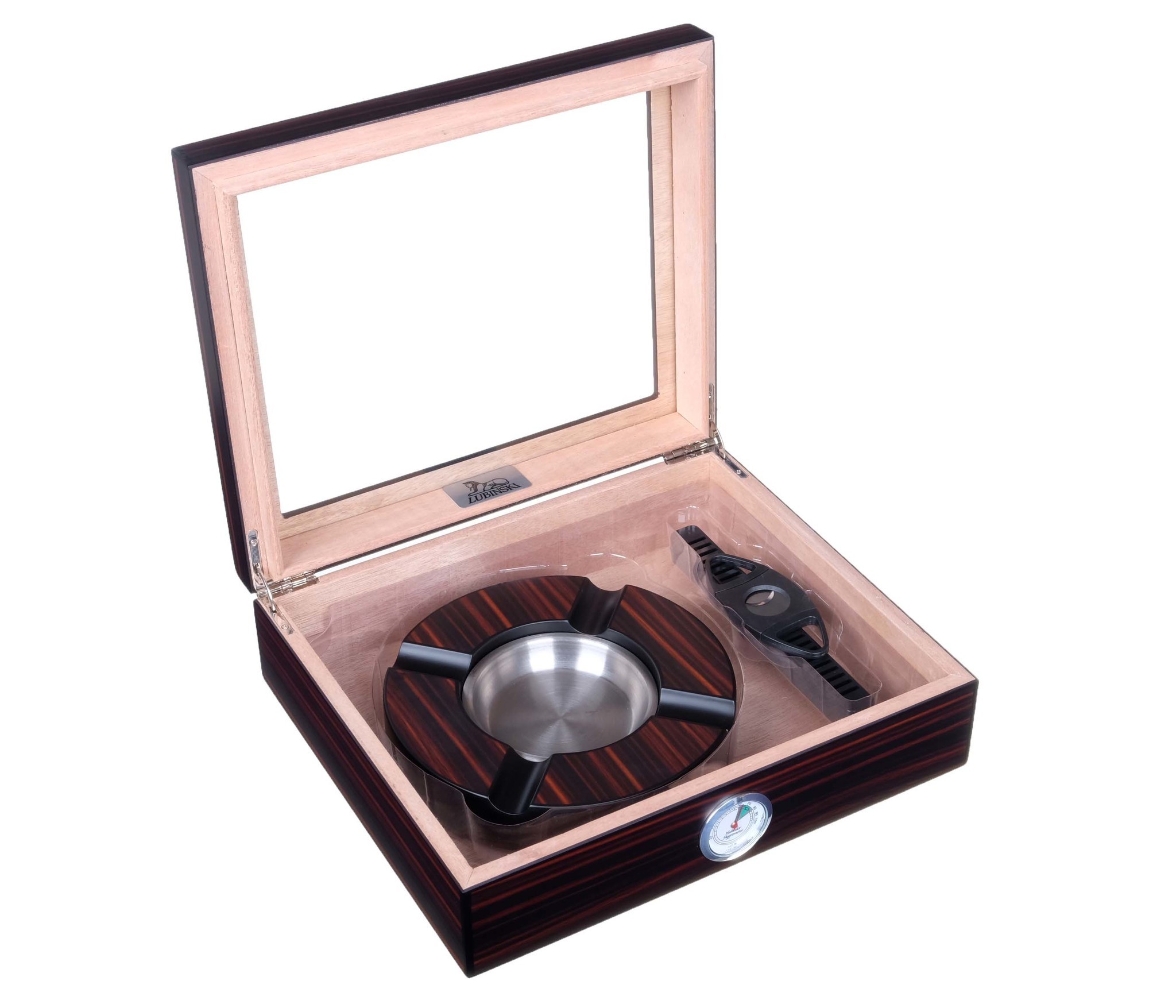 Хьюмидор на 25 сигар в наборе с пепельницей и гильотиной от итальянской компании Lubinski. Внутренняя отделка выполнена из испанского кедра, произрастающего в Латинской Америке.