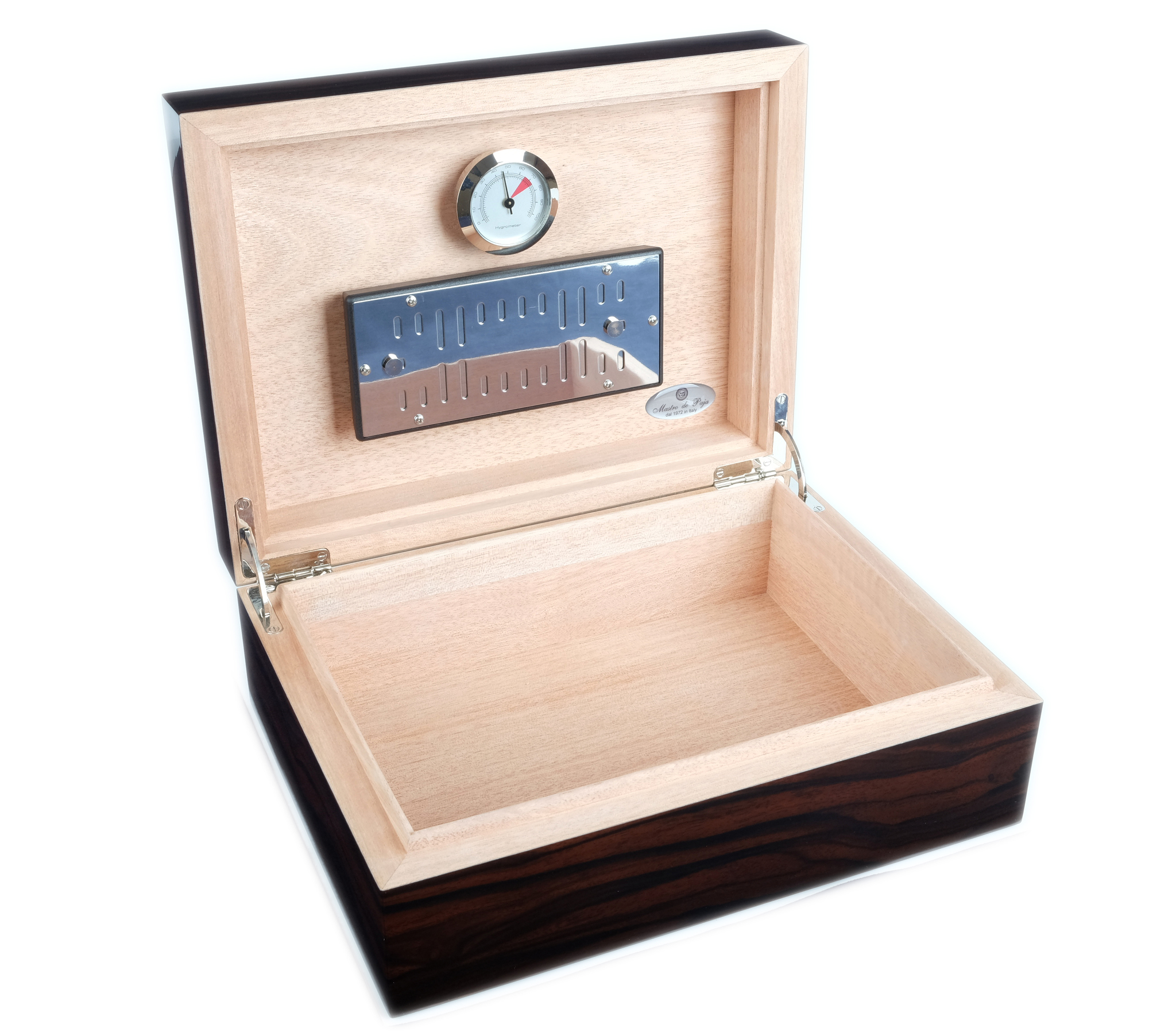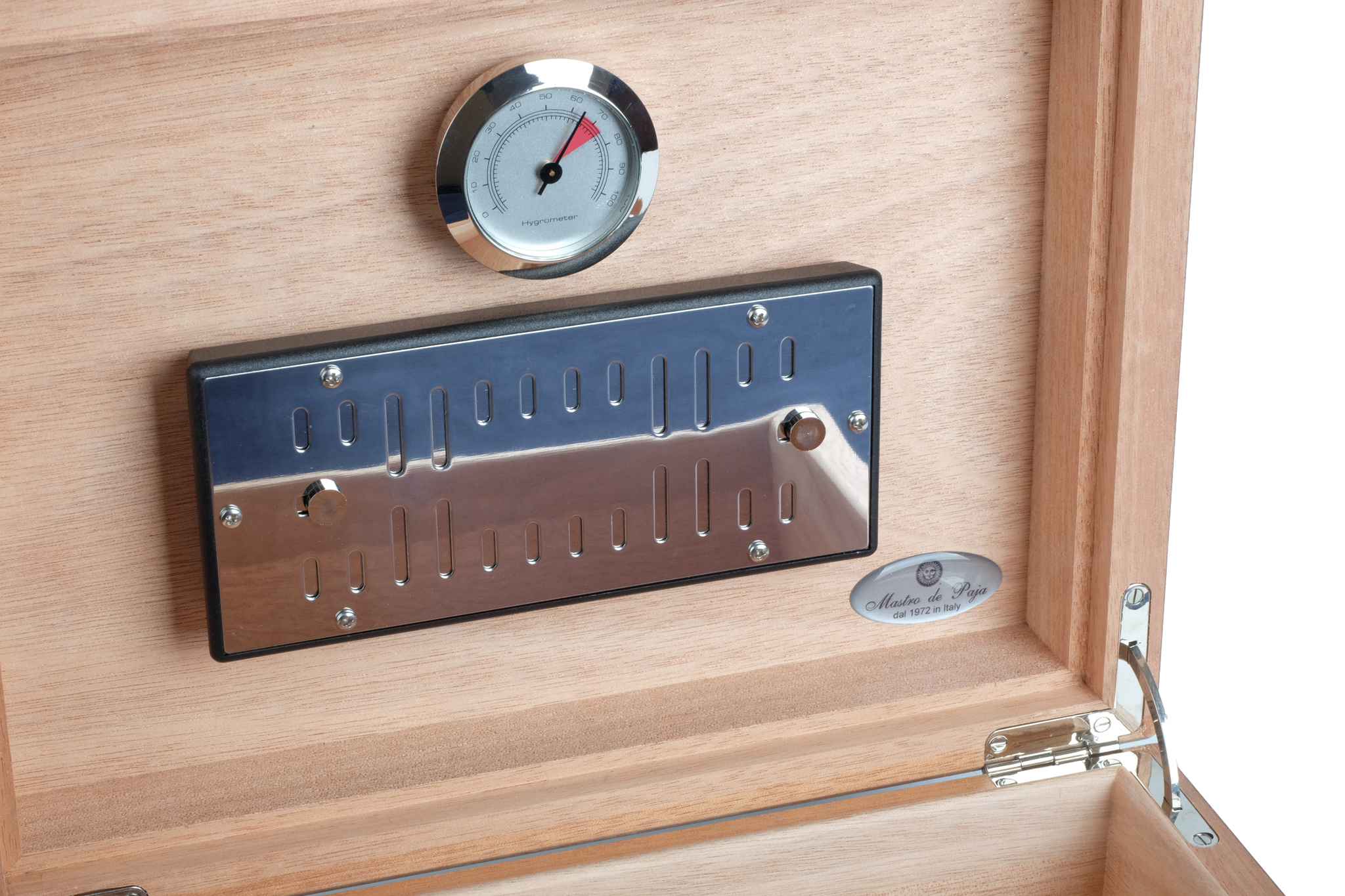 Корпус хьюмидора представляет собой комбинацию нескольких видов дерева, что обеспечивает стойкость к деформации при колебаниях температуры и влажности (ведь разница во влажности внутри и снаружи хьюмидора может достигать 50%). Внутренняя отделка Mastro de Paja выполнена из испанского кедра, произрастающего в Латинской Америке. Наружная отделка — шпон макассара. В комплекте с хьюмидором идут увлажнитель со шторками для регулировки интенсивности увлажнения, стрелочный гигрометр, подробная инструкция по уходу, подарочная упаковка. Наполнитель увлажнителя — акриловый полимер в шариках. При заполнении дистиллированной водой шарики увеличиваются в течение 20 минут с 1-2 мм до 8-10 мм и заполняют весь объем. В процессе эксплуатации шарики снова уменьшаются, указывая на необходимость повторной заправки водой.