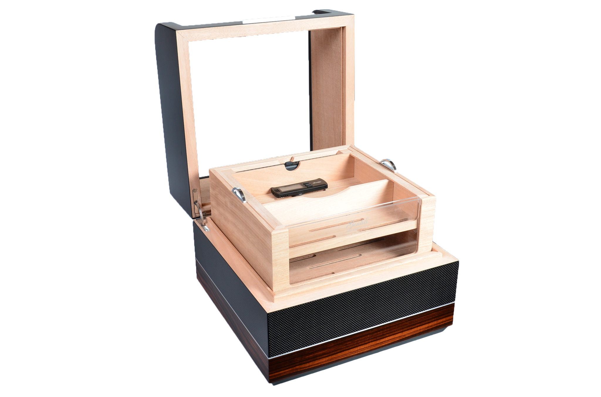 Хьюмидор ручной работы на 120 сигар. В комплекте 3 увлажнителя с акриловым полимером, электронный термогигрометр, съемные лотки , фирменный буклет Gentili с информацией о компании и мультиязычной инструкцией по уходу. Подарочная коробка.