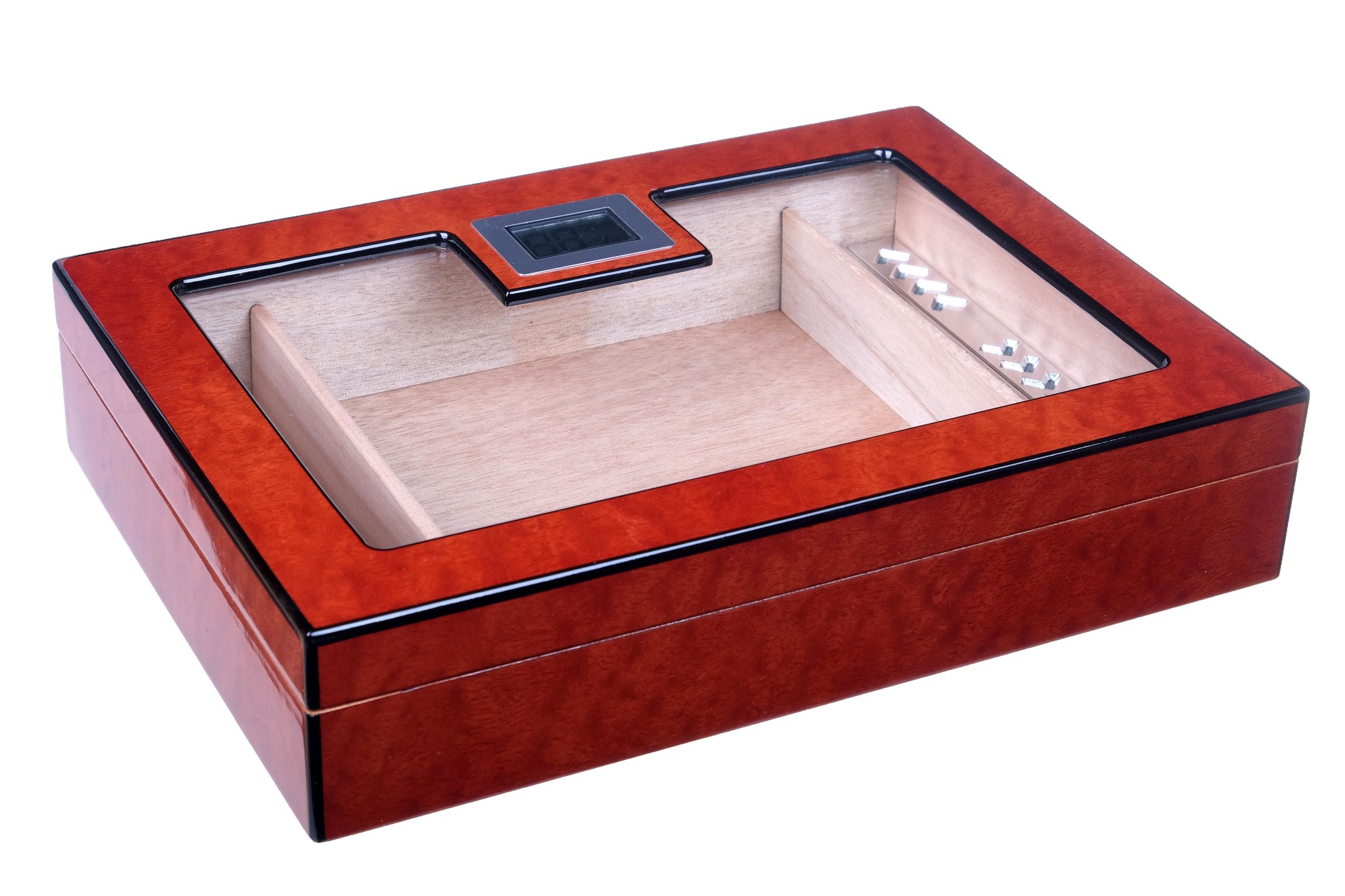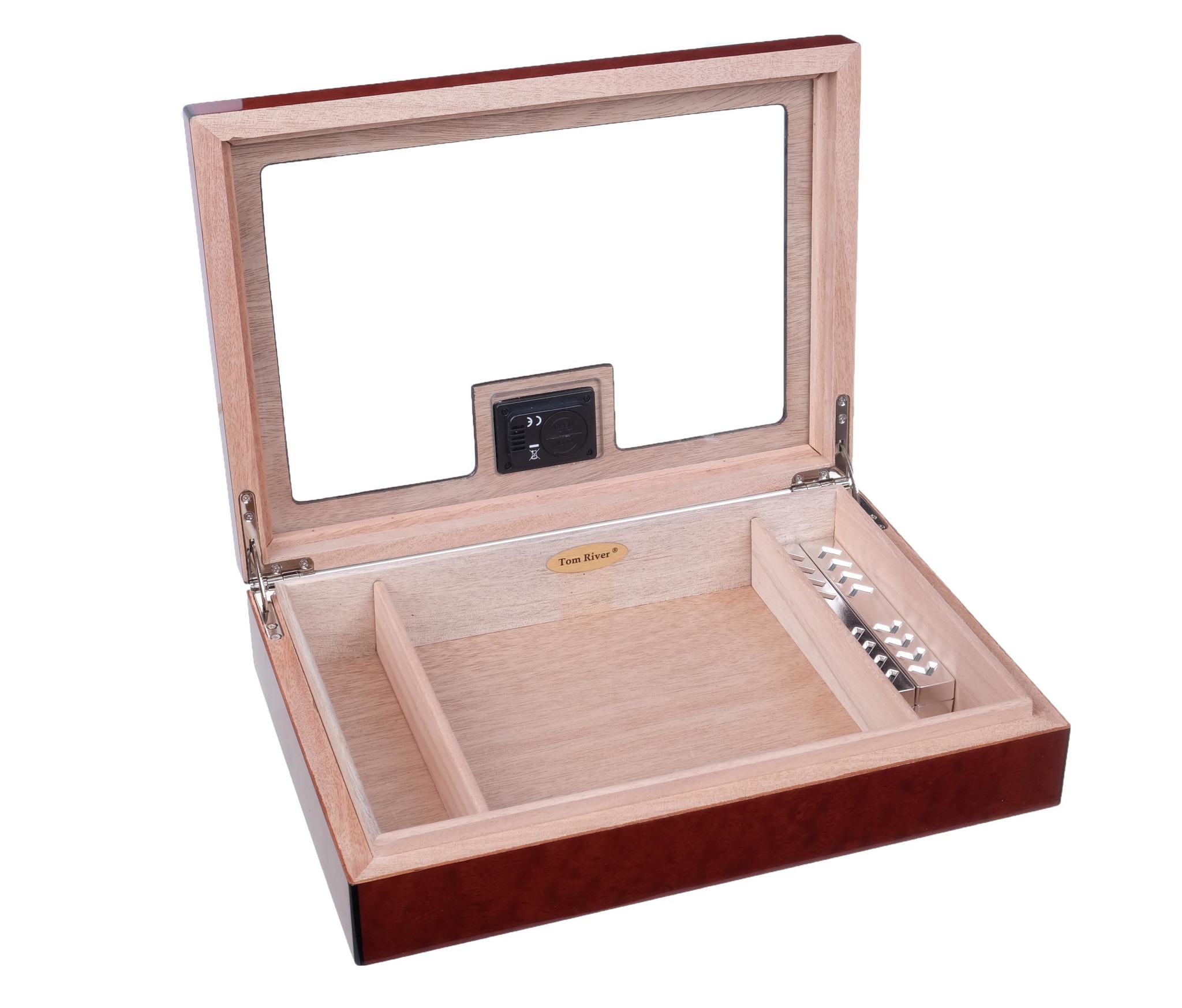 Хьюмидор со стеклом на 25 сигар тайваньской марки Tom River. Внутренняя отделка — испанский кедр из Латинской Америки, снаружи — ламинация Красное дерево. В комплекте увлажнитель с биогубкой, электронный термогигрометр, инструкция по уходу.