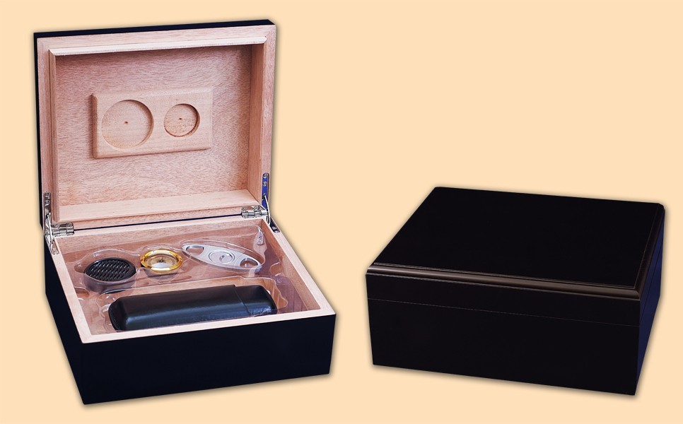 В набор входит: хьюмидор, увлажнитель, гигрометр, футляр для сигар, гильотина