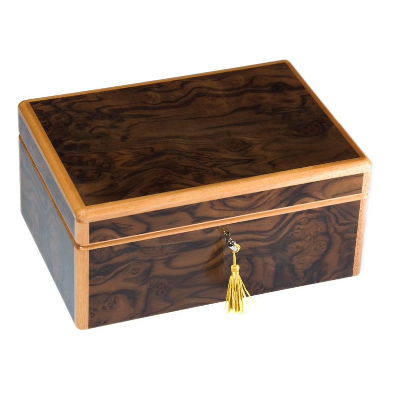Хьюмидор отделан экзотическими породами дерева. Мозаика выполнена из кусочков редких пород дерева, имеющих различную текстуру и окраску. Спрессованные друг с другом, они образуют необычные формы. Эскиз мозаики рисуется на тонкой бумаге, которую затем помещают на изделие. Мастера старательно наносят ажурную инкрустацию, следуя рисунку. Кусочек за кусочком тонкие слои дерева наносятся сначала на бумажную основу. Отдельные части мозаики, требующие дополнительного блестящего эффекта, погружаются на 10 секунд в горячее масло, что придает необычный цвет и дополнительный блеск дереву. Для составления мозаики применяется специальный клей, которым покрывается вся поверхность бумажного листа, помещаемого на деревянную поверхность. Затем изделие шлифуют до получения идеально гладкой поверхности. В качестве последнего штриха поверхность пропитывают специальным маслом. Такой подарок - бесценное наследство, которое будет жить вечно.