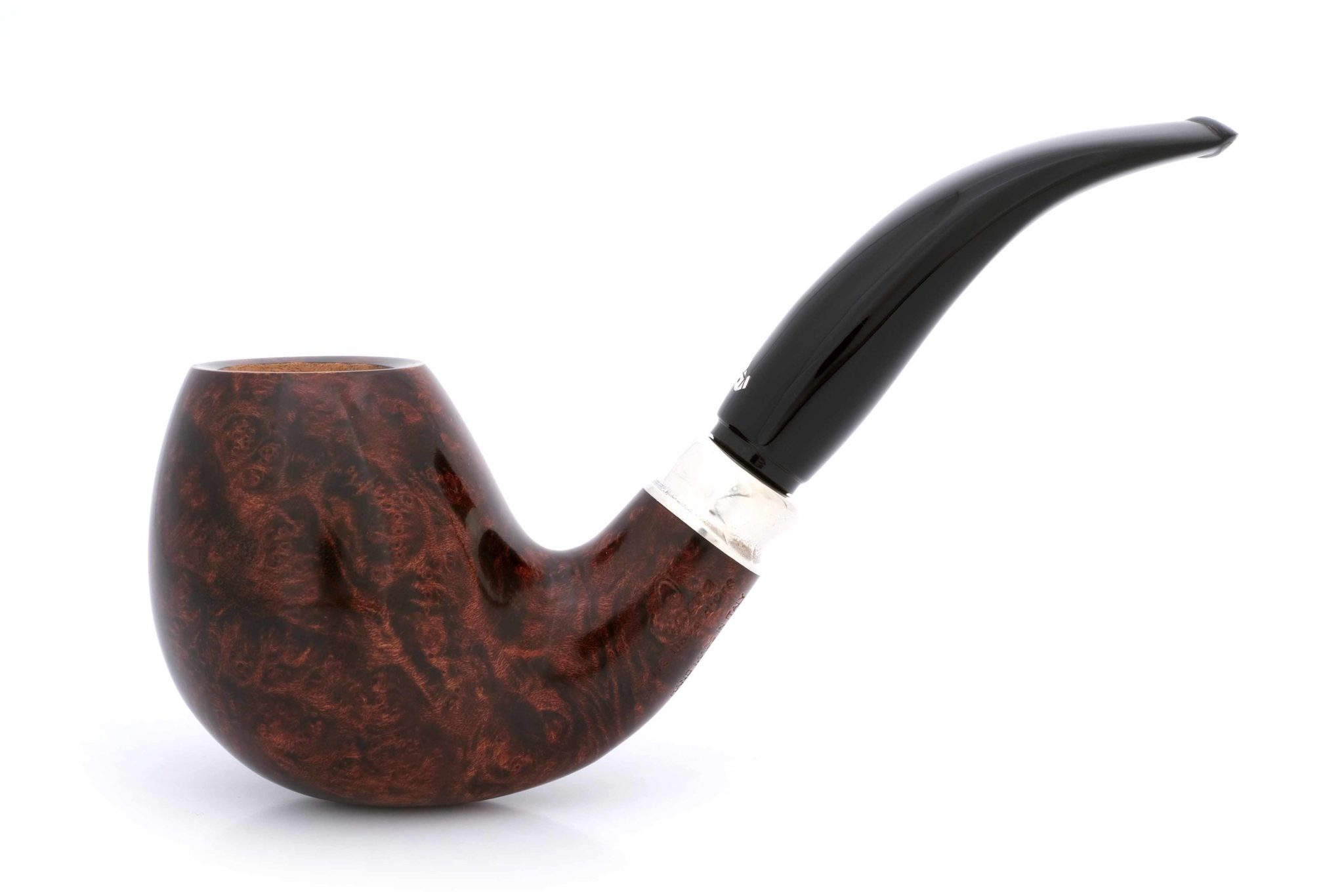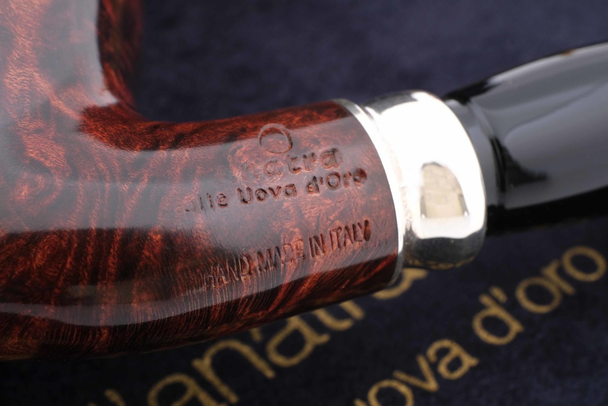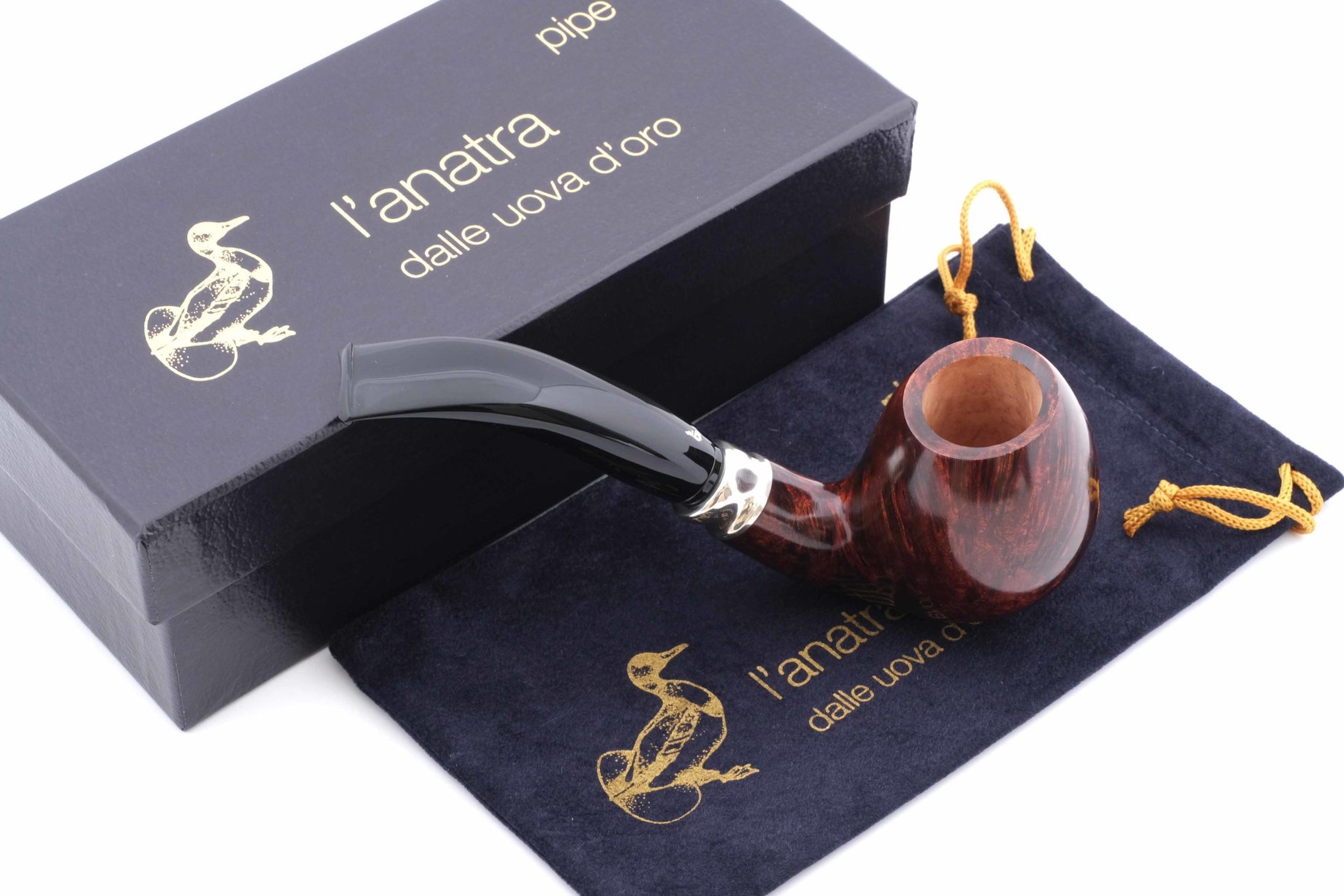 На мундштуке нанесен символ компании — серебряная голова утки и на чубуке — девиз L’Anatra dalle uova d’oro — «Утка несущая золотые яйца» и Hand made in Italy. Мундштук — акрил. Фигурное кольцо из серебра 925 пробы. Фирменный кисет и подарочная коробка прилагаются.