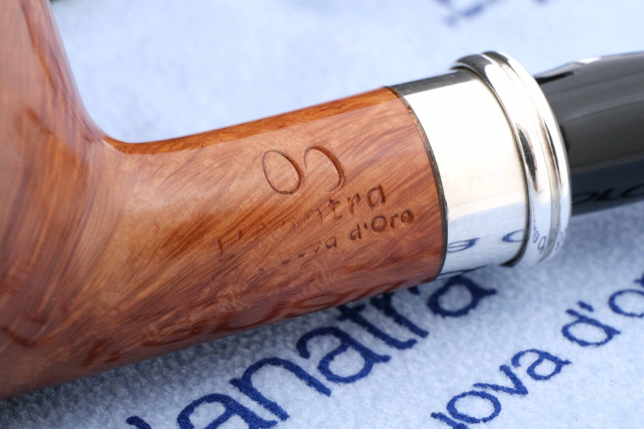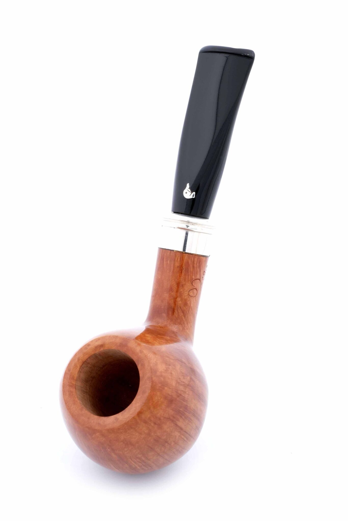 На мундштуке нанесен символ компании — серебряная голова утки и на чубуке — девиз L’Anatra dalle uova d’oro — «Утка несущая золотые яйца» и Hand made in Italy. Кольцо из серебра 925 пробы. Фильтр 9 мм. Вес 63 гр. Длина трубки 14 см. Высота чашки 49 мм. Диаметр табачной камеры 20 мм., глубина 39 мм. Фирменный кисет и подарочная коробка прилагаются. Ручная работа, единственный экземпляр.
