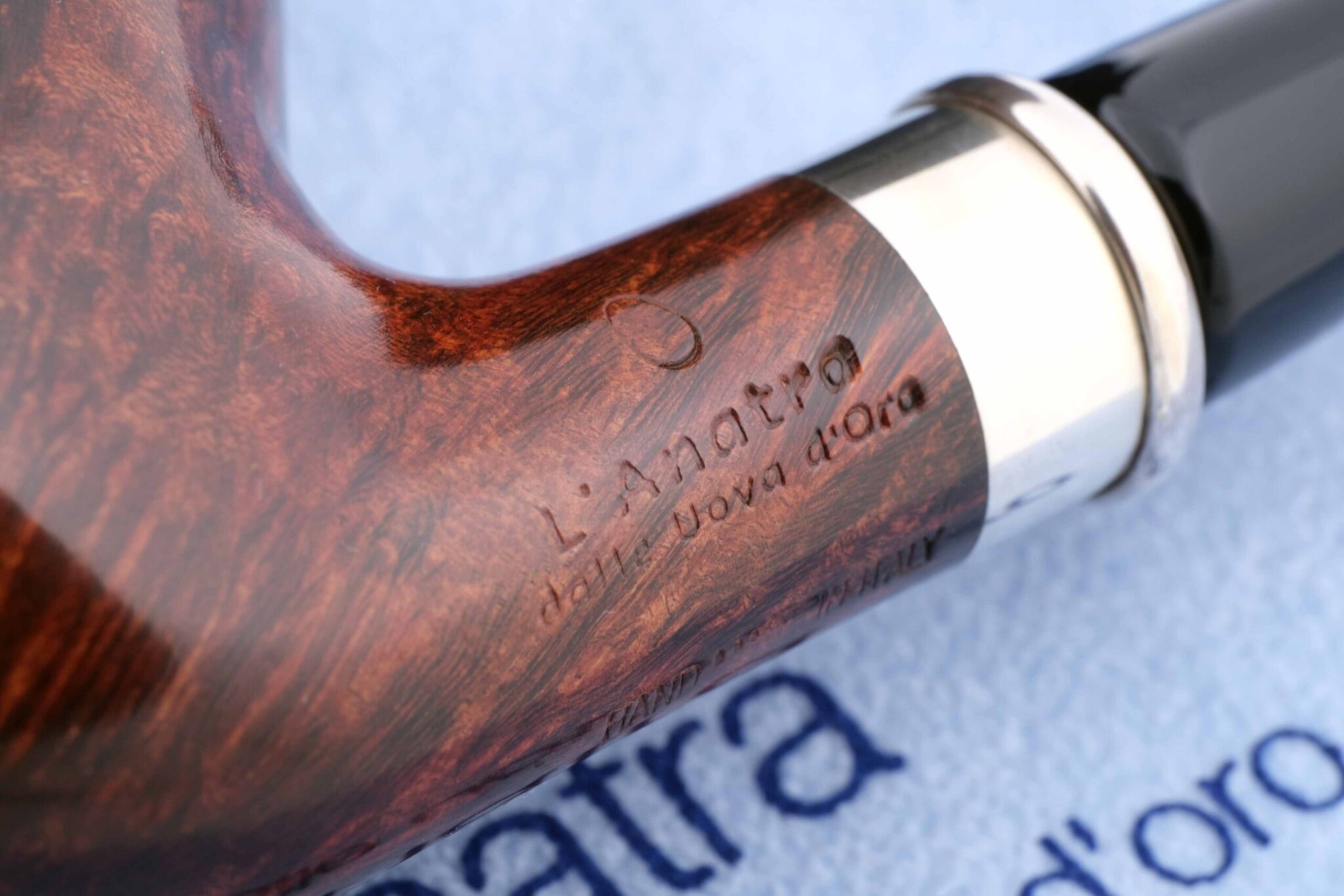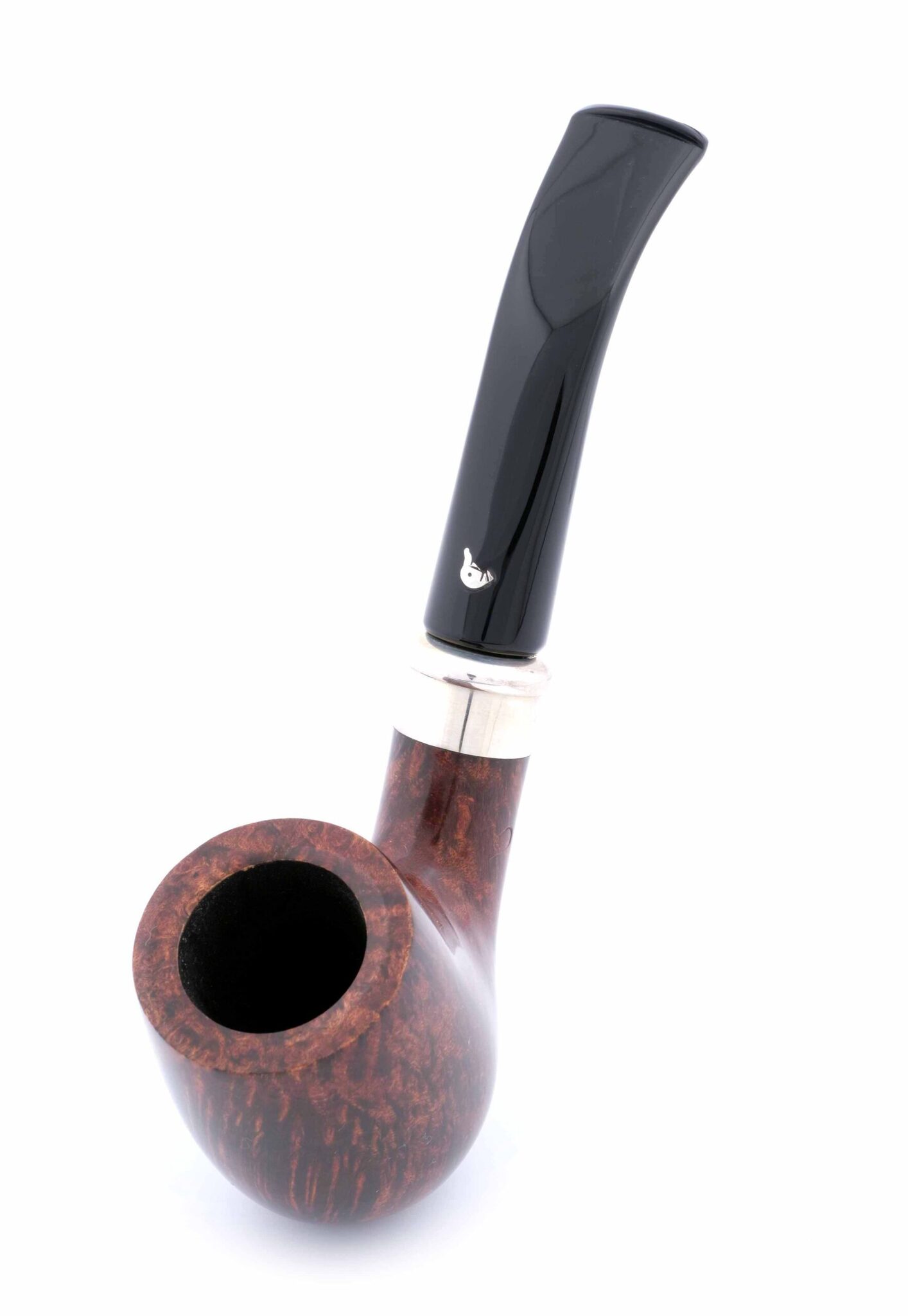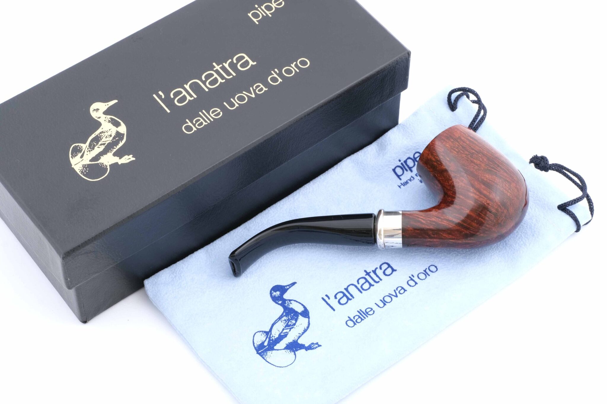 Авторская курительная трубка L'Anatra грэйда "1 яйцо". Мундштук - акрил. На мундштуке нанесен символ компании - серебряная голова утки и на чубуке - девиз L'Anatra dalle uova d'oro - "Утка несущая золотые яйца" и Hand made in Italy. Кольцо из серебра 925 пробы. Фильтр 9 мм. Вес 54 гр. Длина трубки 14 см. Высота чашки 53 мм. Диаметр табачной камеры 20 мм., глубина 45 мм. Фирменный кисет и подарочная коробка прилагаются. Ручная работа, единственный экземпляр.