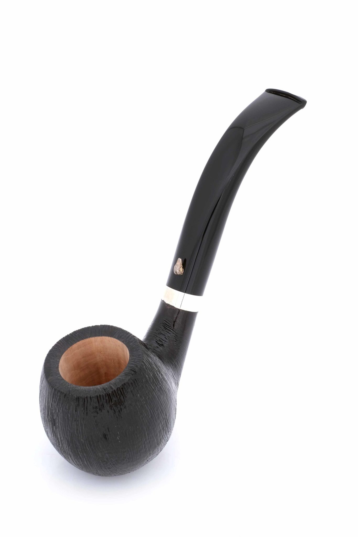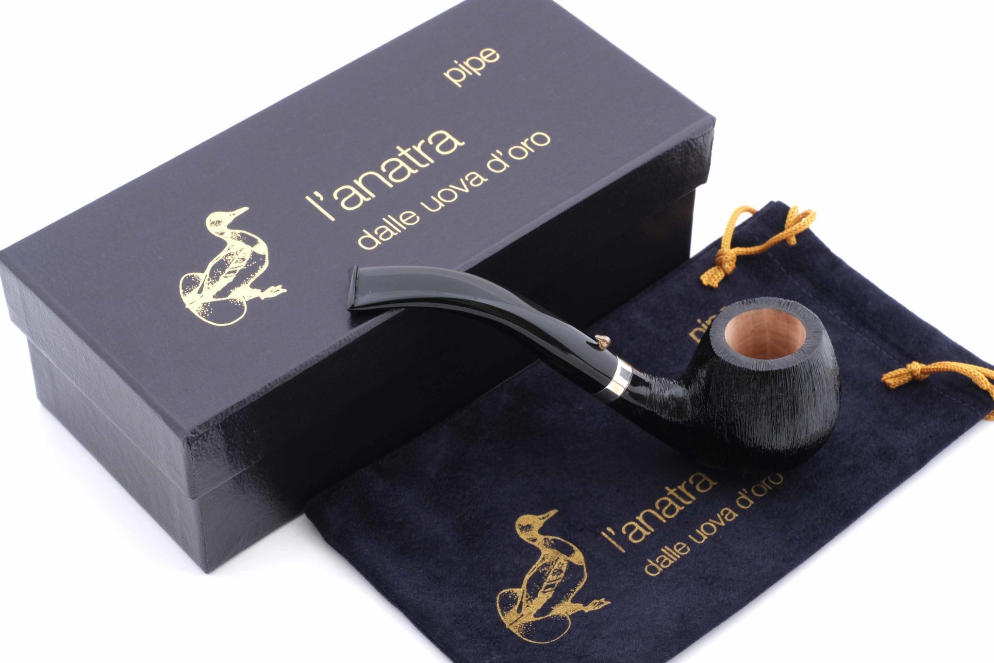 Трубка приятно держится в руке, а увеличенная за счет рустирования площадь поверхности способствует лучшему охлаждению трубки при курении. Мундштук — акрил. На мундштуке нанесен символ компании — серебряная голова утки и на чубуке — девиз L’Anatra dalle uova d’oro — «Утка несущая золотые яйца» и Hand made in Italy. Кольцо из серебра 925 пробы. Фирменный кисет и подарочная коробка прилагаются.