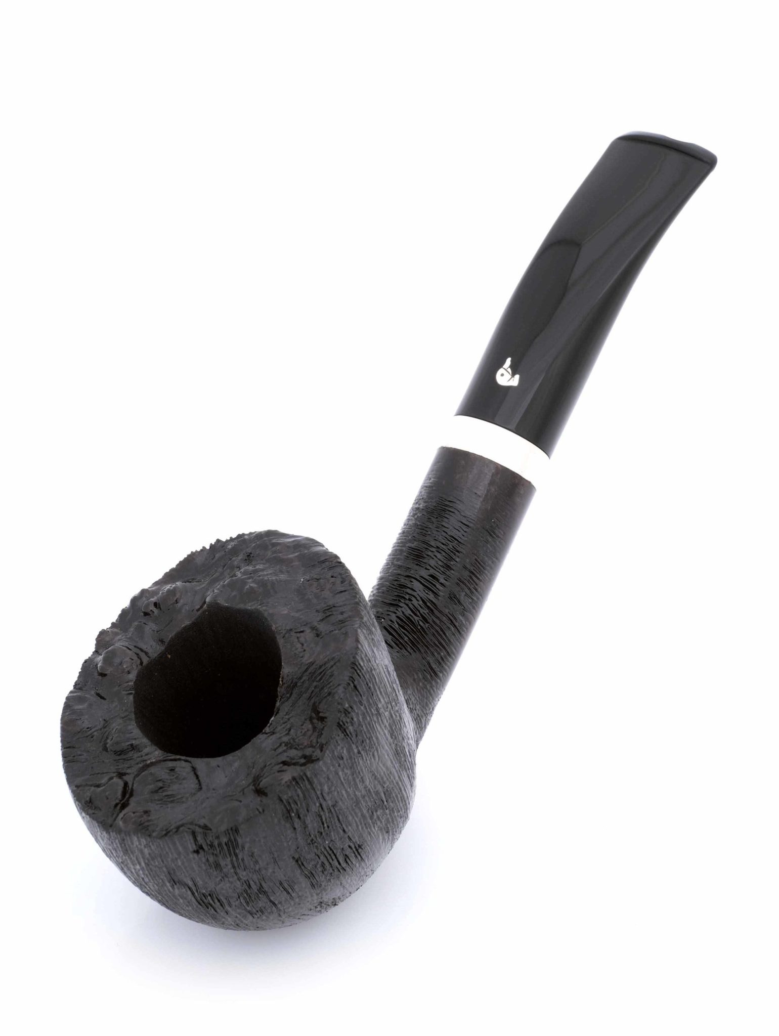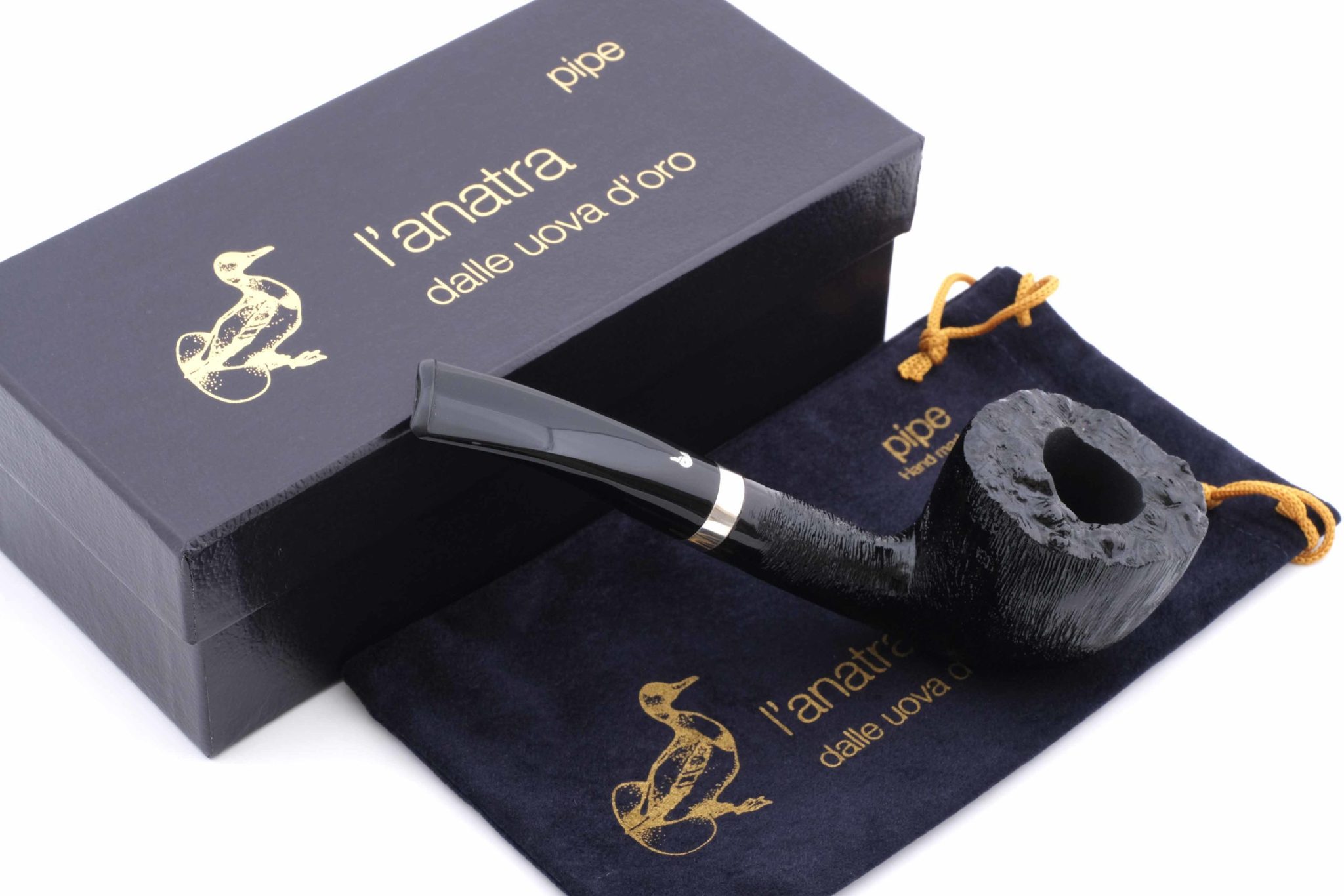Трубка приятно держится в руке, а увеличенная за счет рустирования площадь поверхности способствует лучшему охлаждению трубки при курении. Мундштук — акрил. На мундштуке нанесен символ компании — серебряная голова утки и на чубуке — девиз L’Anatra dalle uova d’oro — «Утка несущая золотые яйца» и Hand made in Italy. Кольцо из серебра 925 пробы. Фирменный кисет и подарочная коробка прилагаются.