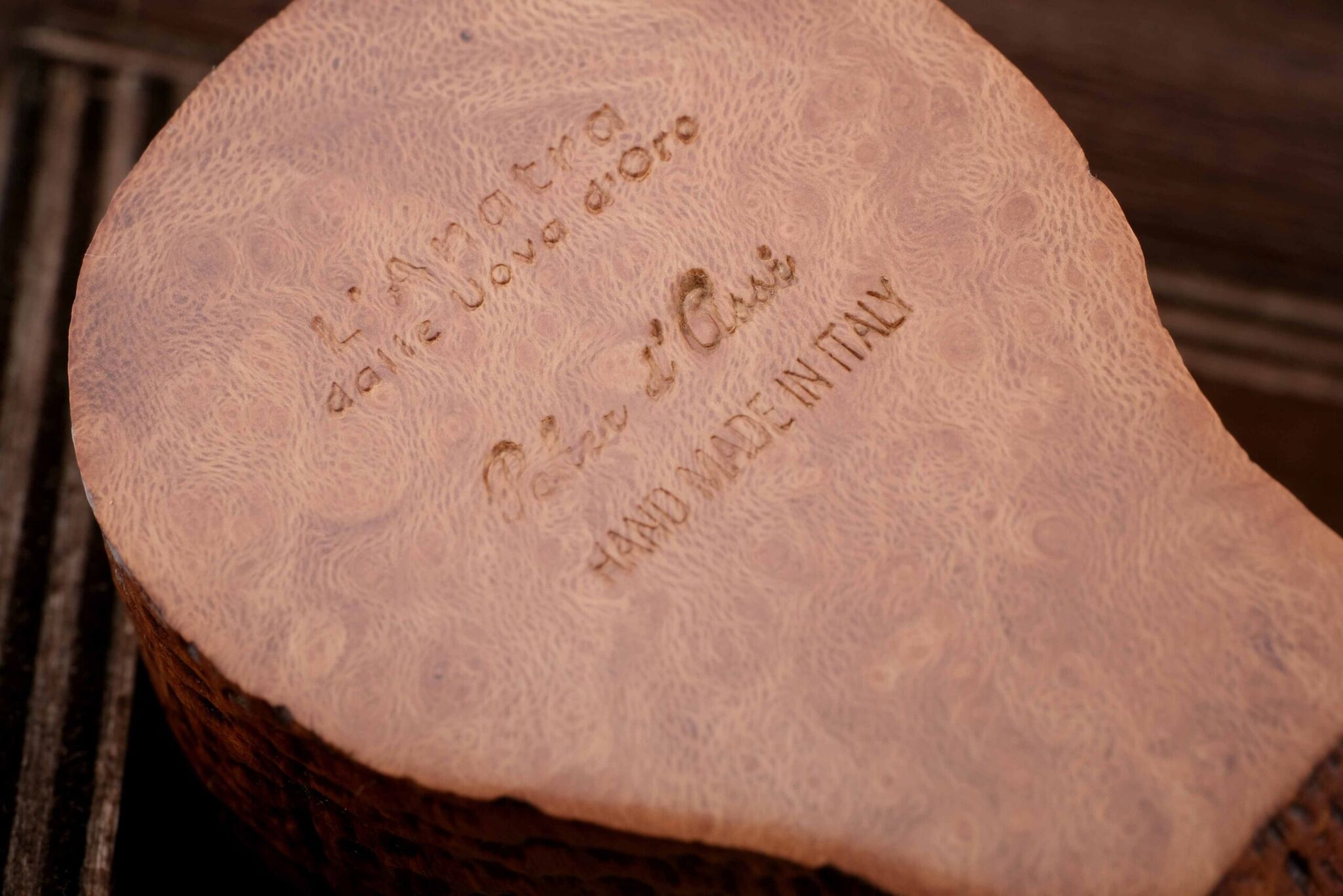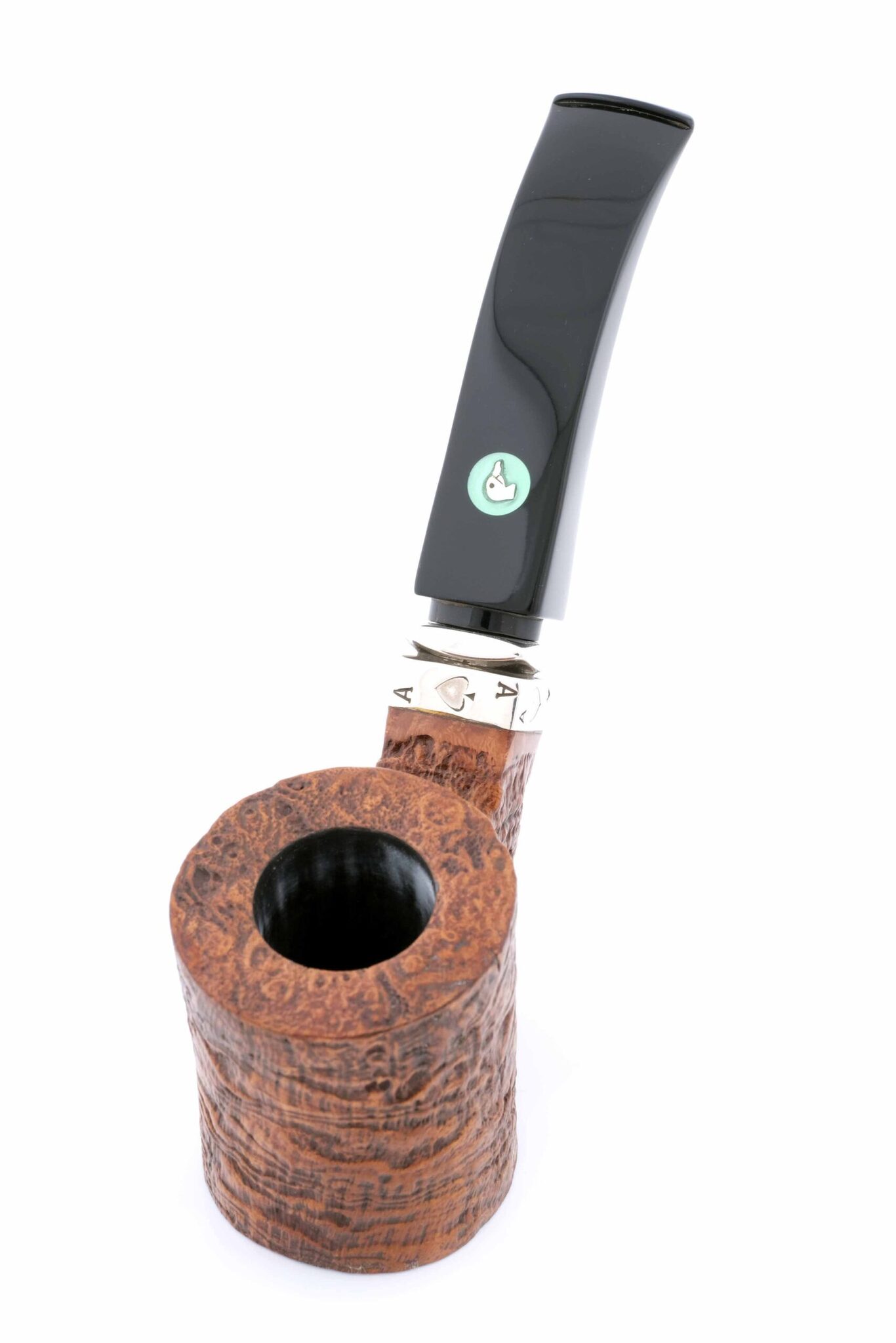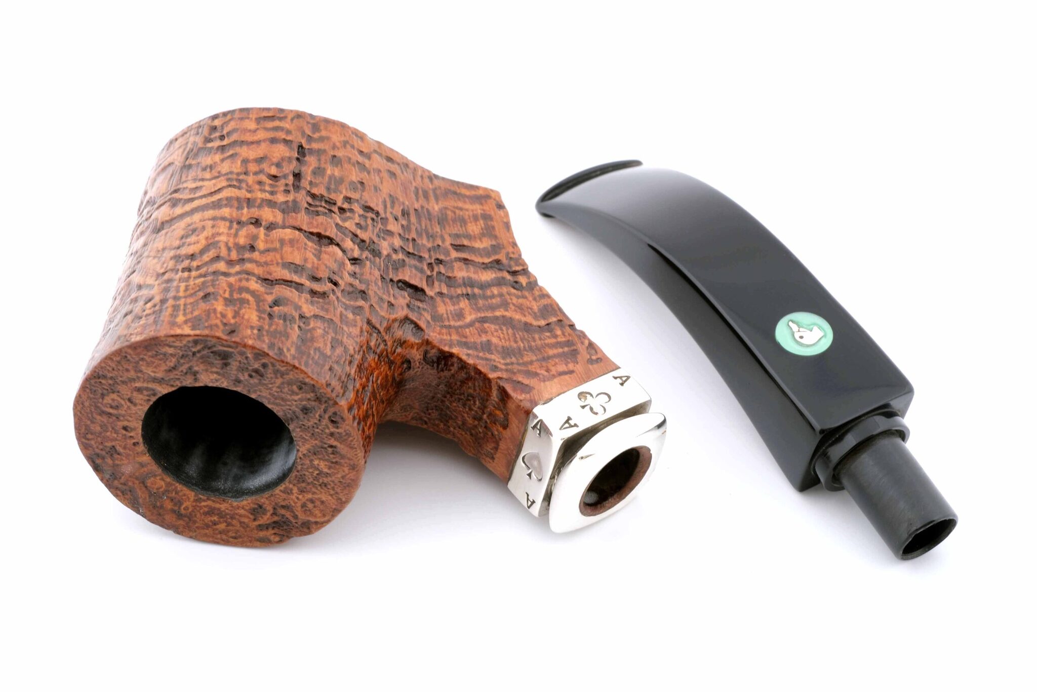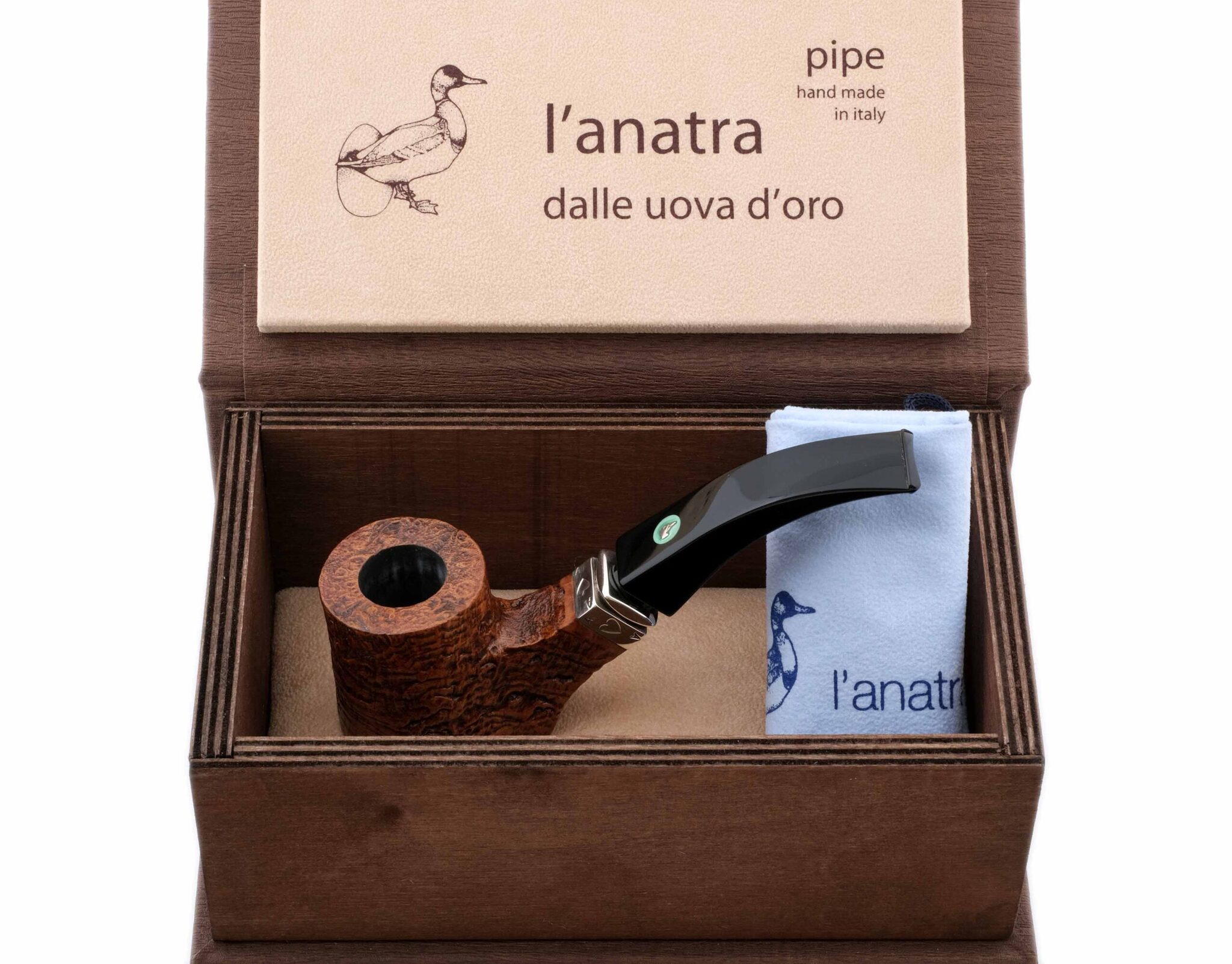 Трубка приятно держится в руке, а увеличенная за счет бласта площадь поверхности способствует лучшему охлаждению трубки при курении. Мундштук — акрил. На мундштуке нанесен символ компании — серебряная голова утки и на чубуке выбит девиз L’Anatra dalle uova d’oro — «Утка несущая золотые яйца» и Hand made in Italy. Кольцо из серебра 925 пробы. Проба выбита на кольце снизу. Фильтр 9 мм. Вес 72 грамм. Длина трубки 13 см. Диаметр чашки 37 мм, Высота чашки 50 мм. Диаметр табачной камеры 20 мм., глубина 40 мм. В комплекте подарочная шкатулка и кисет для трубки.