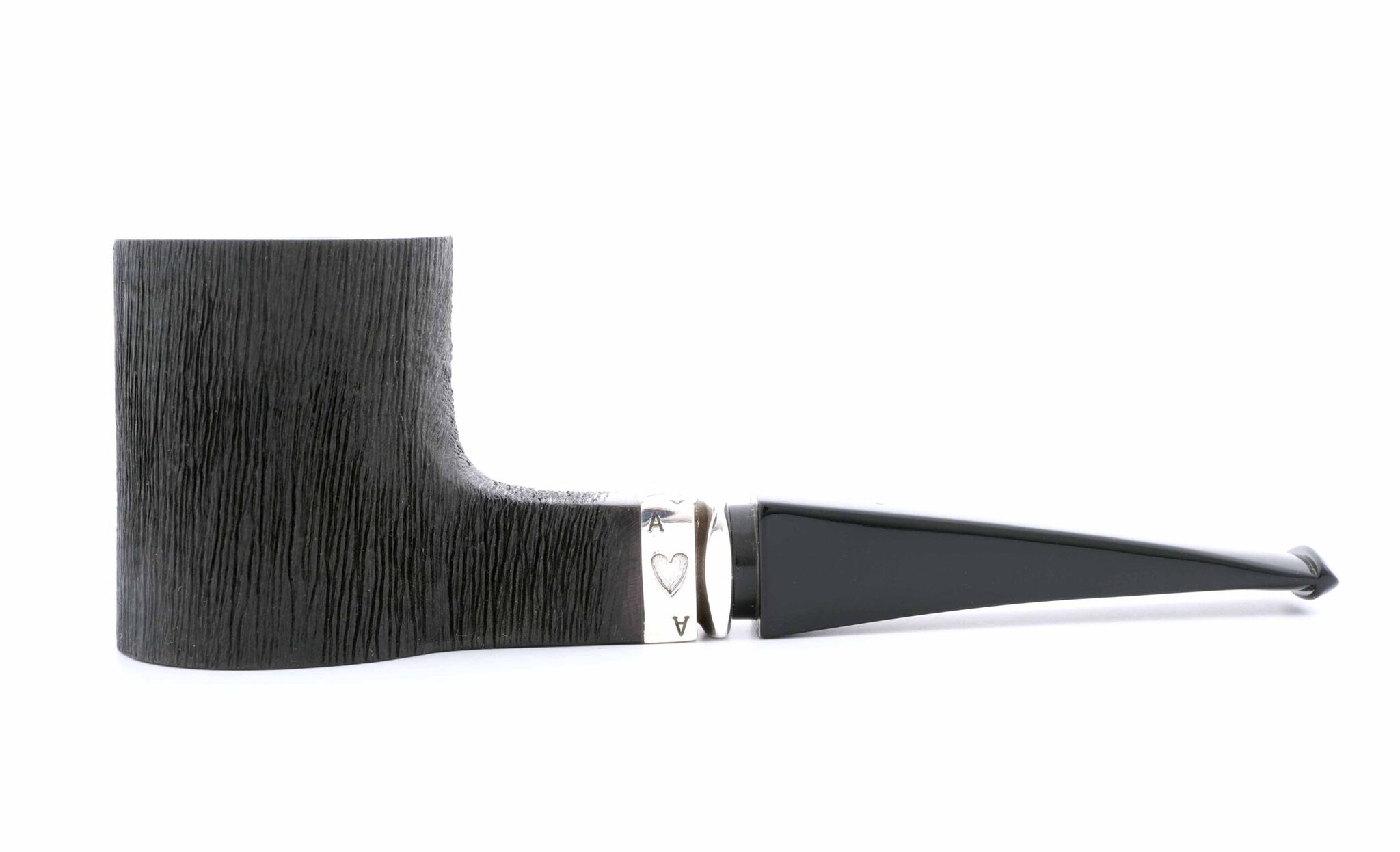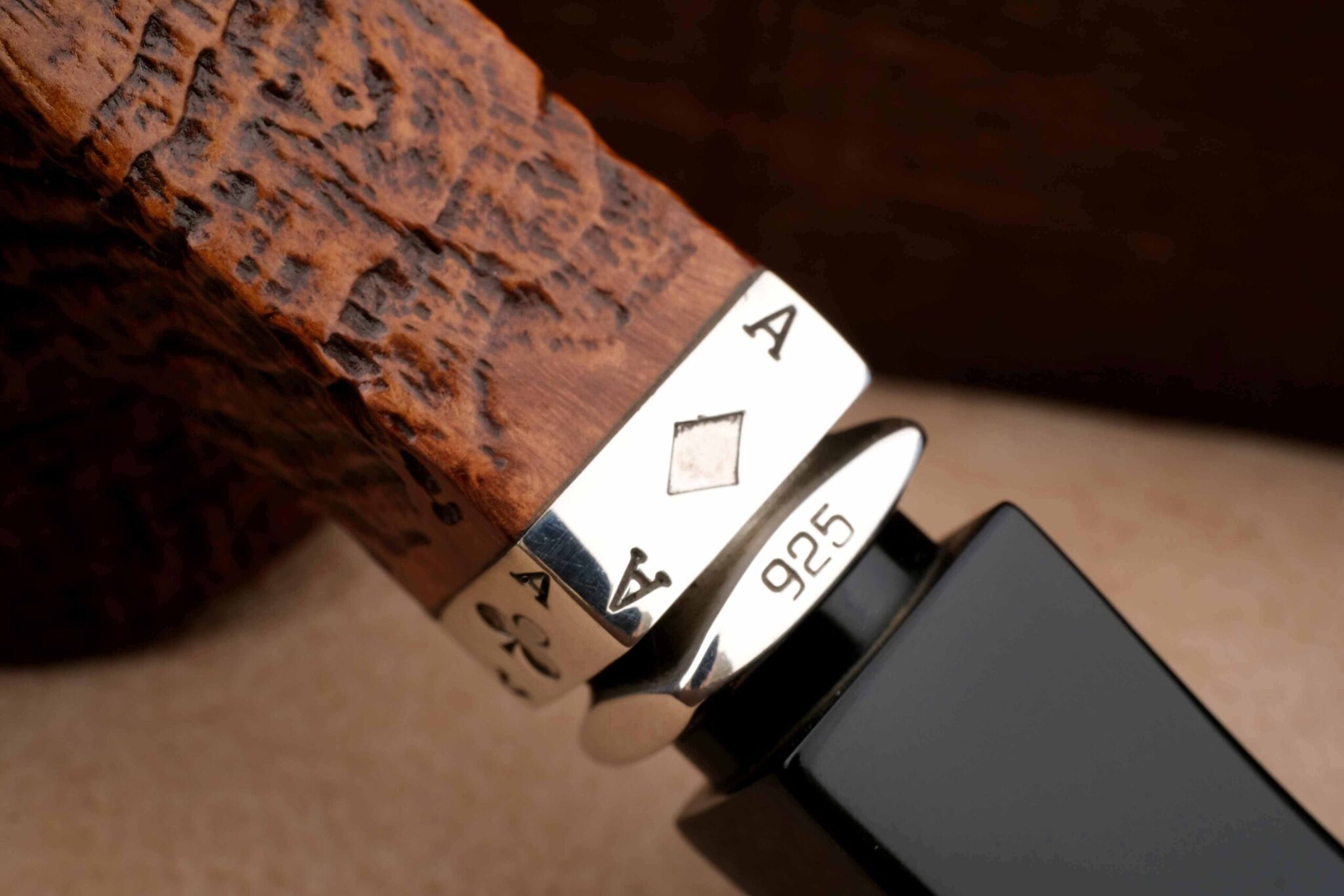 Трубка L’Anatra Poker с изображением карточных мастей на массивном кольце из серебра. Форма Stand-up позволяет ставить трубку на стол во время курения.