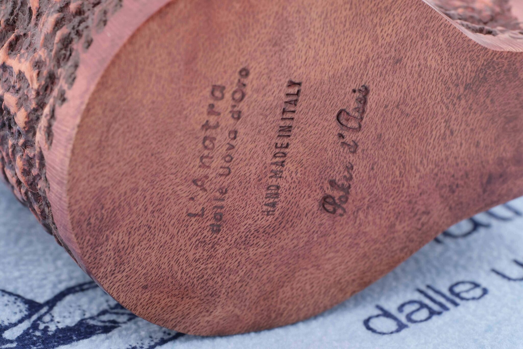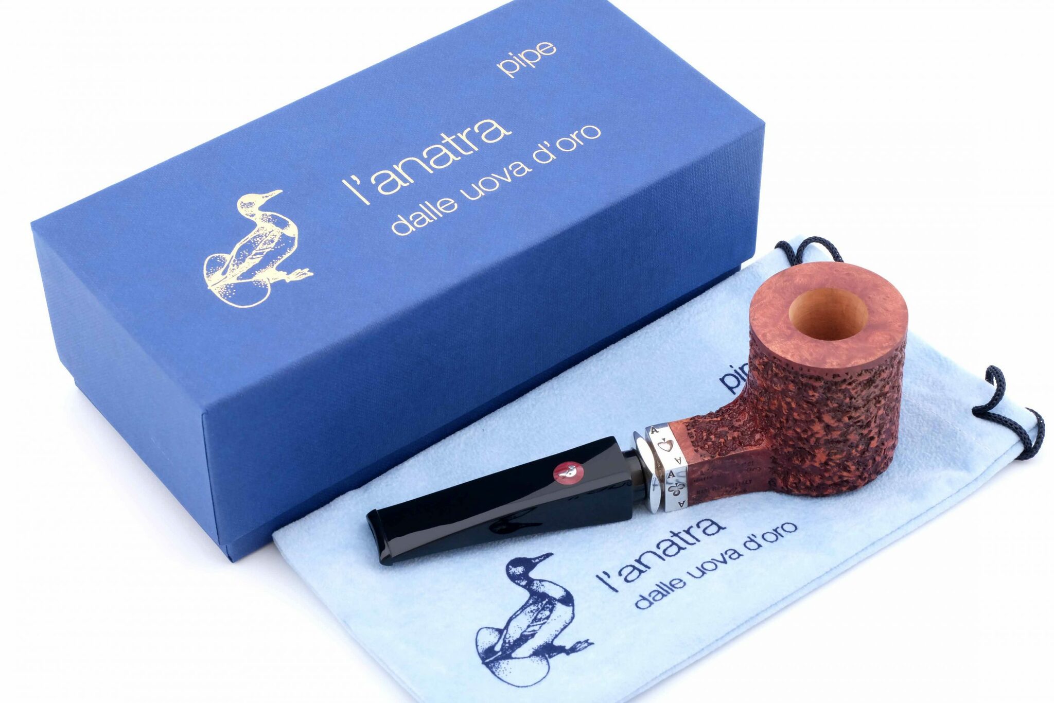 Мундштук — акрил. На мундштуке нанесен символ компании — серебряная голова утки и на чубуке выбит девиз L’Anatra dalle uova d’oro — «Утка несущая золотые яйца» и Hand made in Italy.