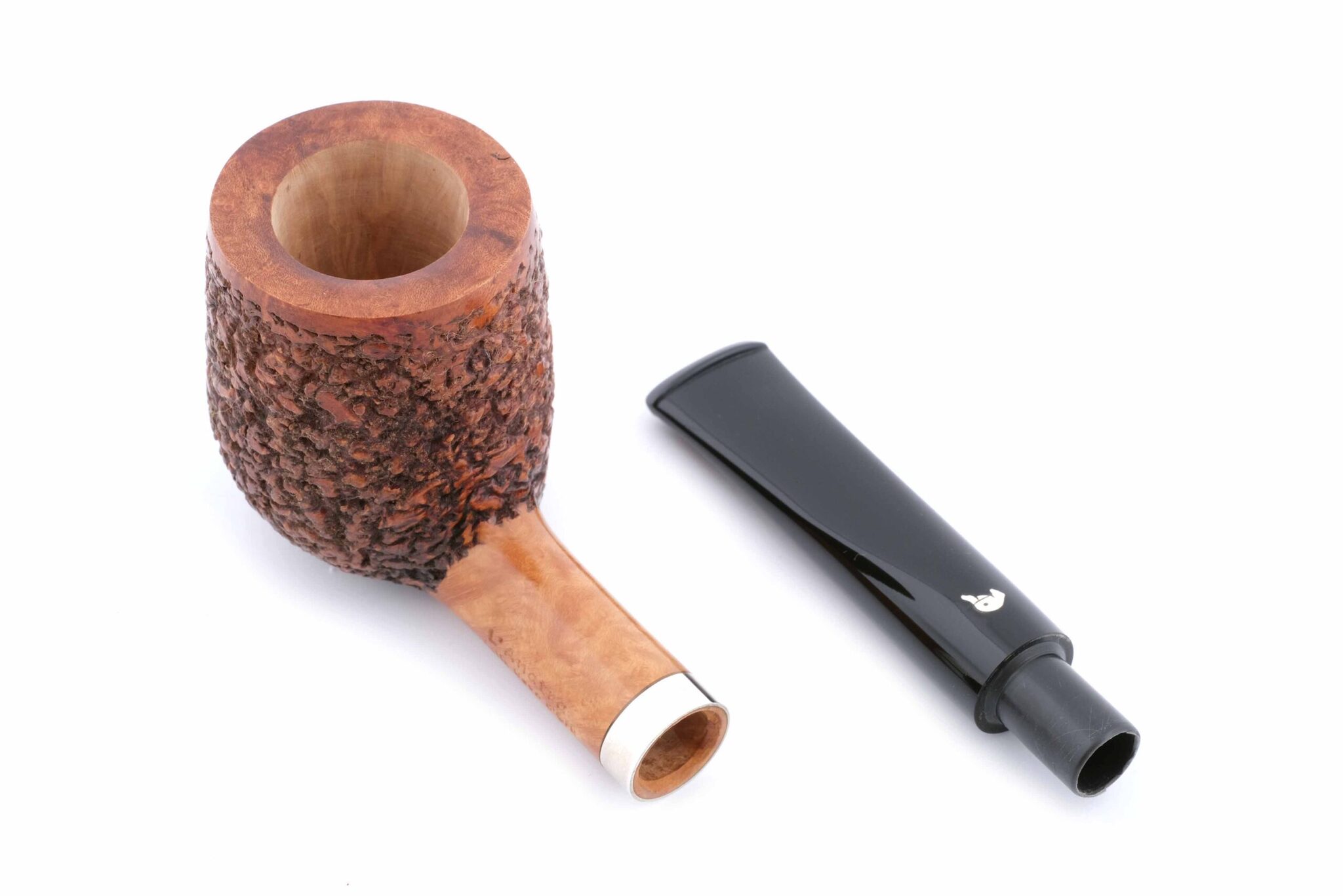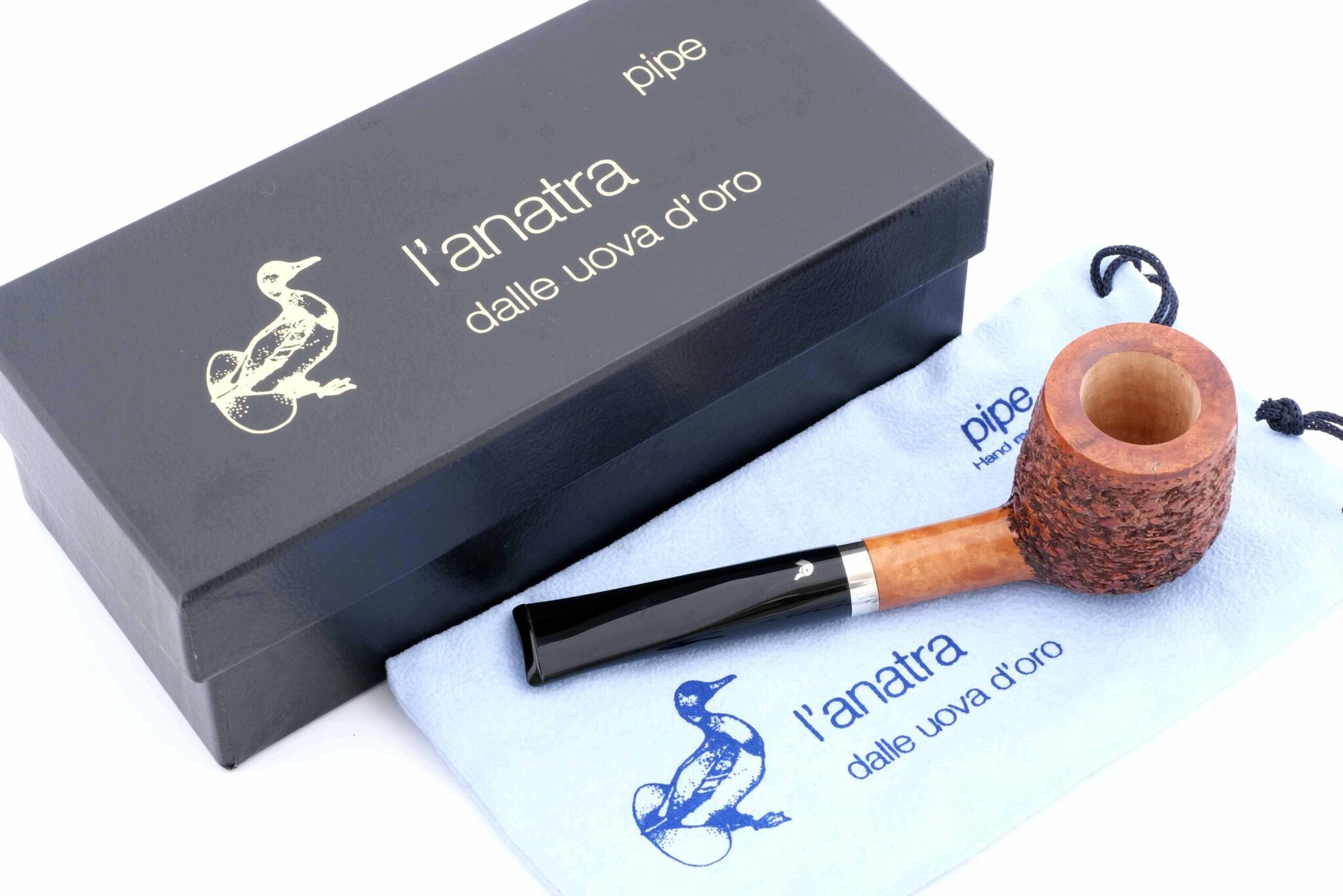 Авторская курительная трубка L'Anatra с отделкой рустированием. Площадь поверхности при этом увеличивается, что способствует лучшему охлаждению чаши и более приятному "прохладному" курению. Также снижается и вес трубки. Форма нижней части позволяет ставить трубку на стол во время курения. Мундштук - акрил. Кольцо на чубуке - серебро 925 пробы. Фильтр 9 мм. Вес 52 гр. Длина трубки 14 см. Высота чашки 48 мм. Диаметр табачной камеры 22 мм., глубина 40 мм. Табачная камера не карбонизирована. Фирменный кисет и подарочная коробка прилагаются. Ручная работа, единственный экземпляр.