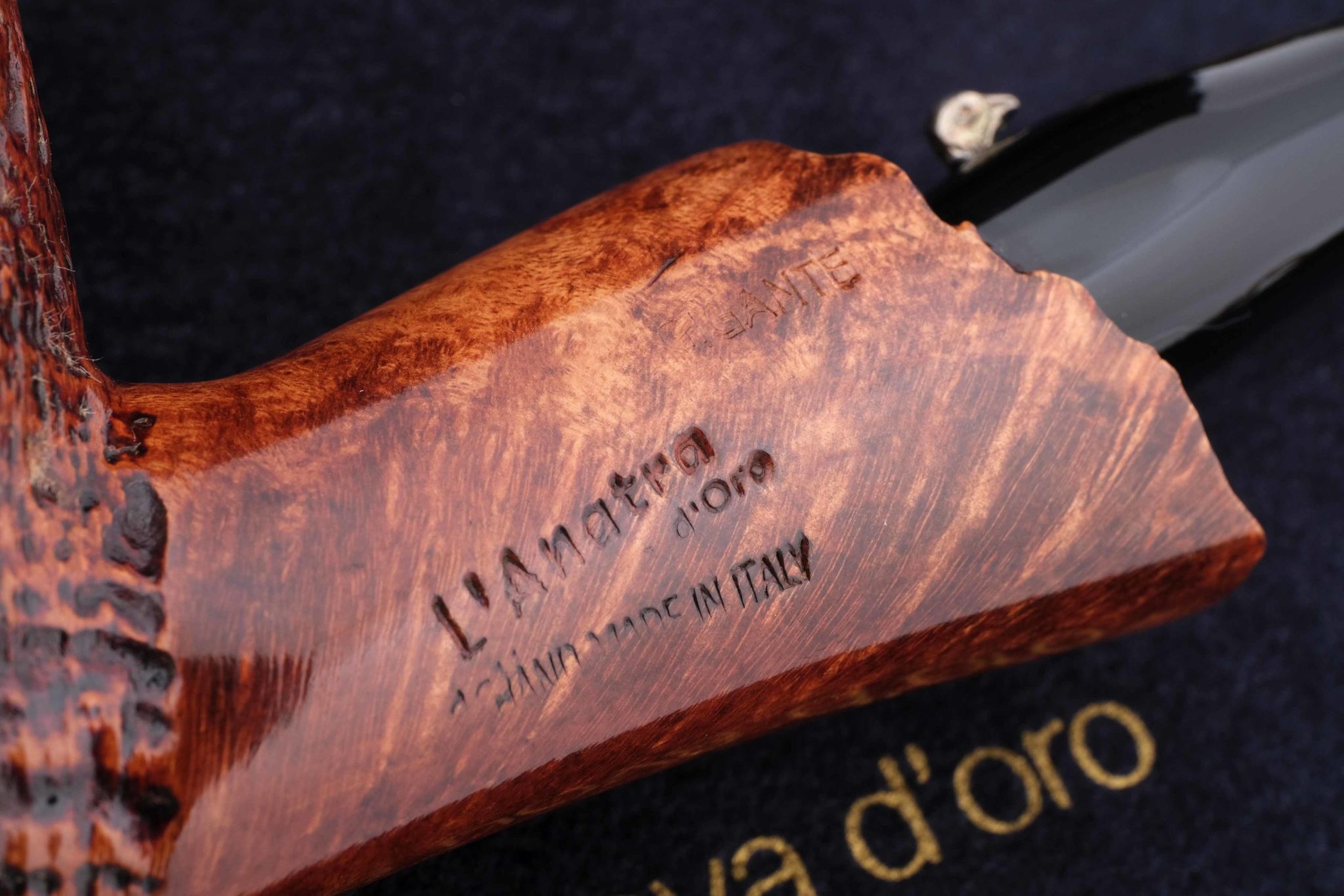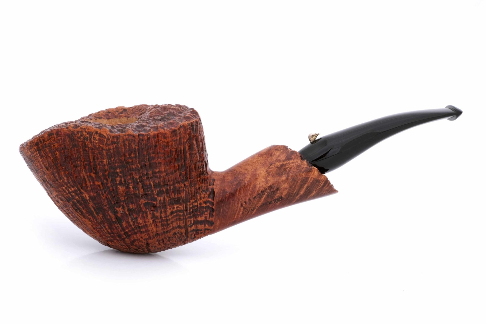 Роскошная курительная трубка из мастерской L`Anatra. Массивная форма Freehand подчеркивает красивый рисунок бриара, а отделка Sandblast придает ему объем.