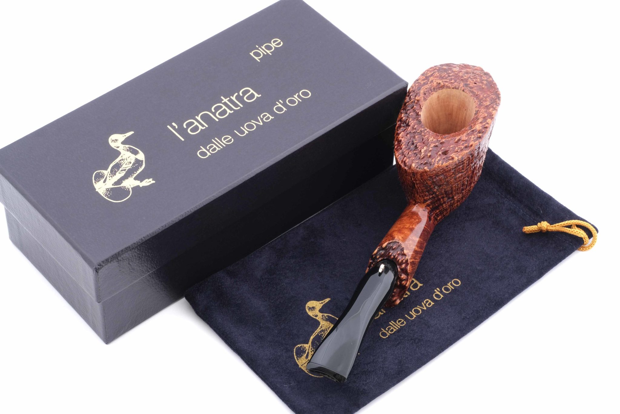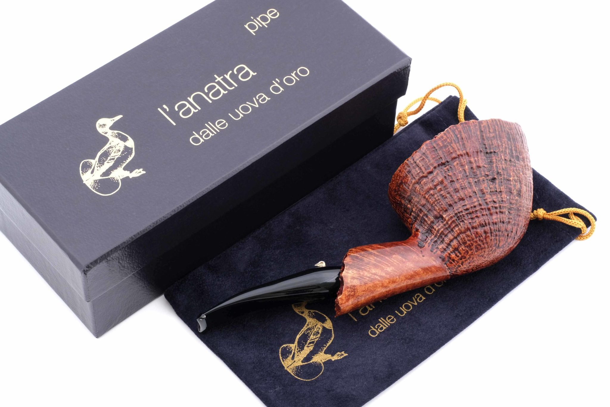 «Венатуры» бриара можно ощутить руками, а увеличенная поверхность чаши способствует более прохладному курению. Мундштук — акрил. На мундштуке нанесен символ компании — серебряная голова утки и на чубуке — девиз L’Anatra dalle uova d’oro — «Утка несущая золотые яйца» и Hand made in Italy. Фирменный кисет и подарочная коробка прилагаются.