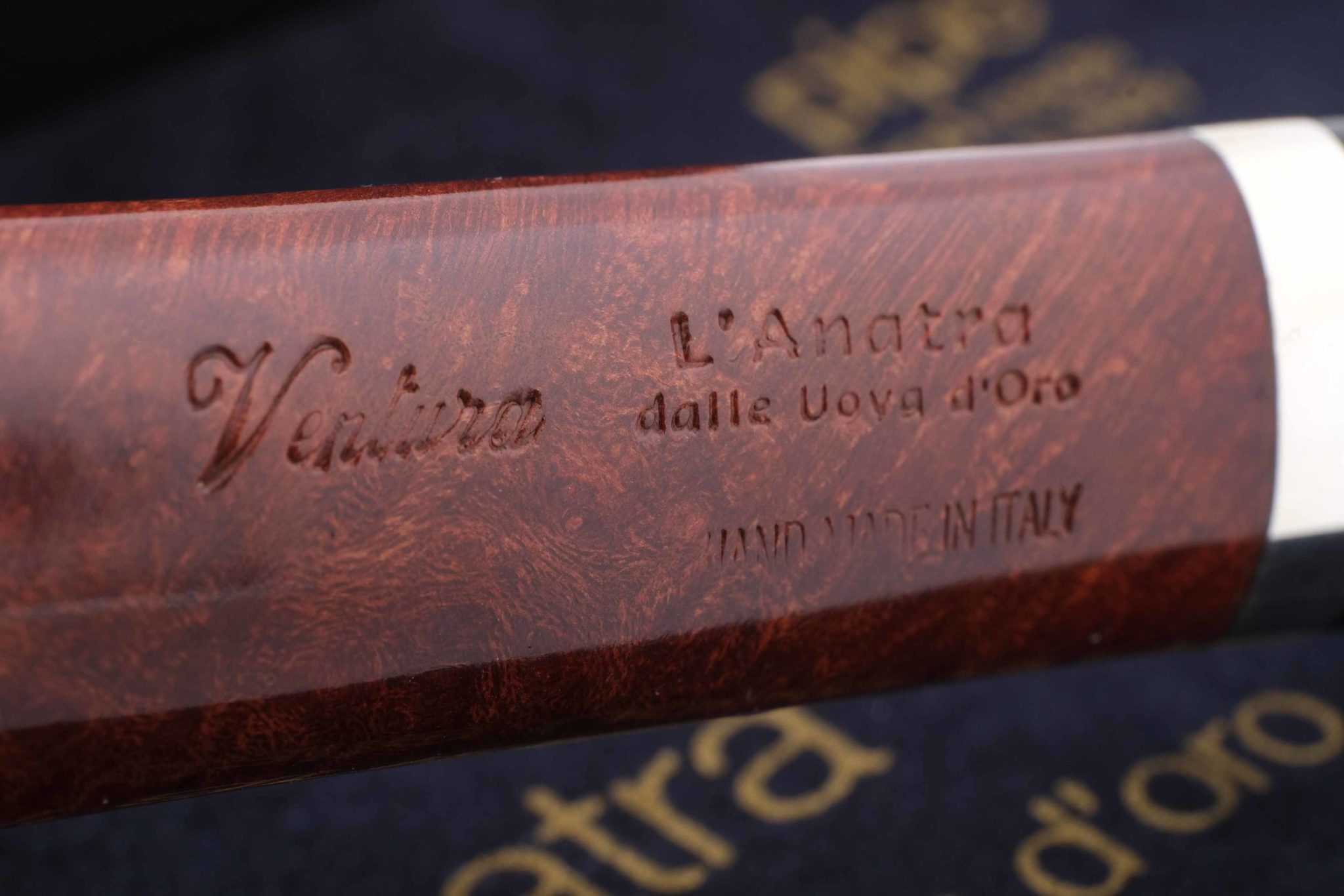 На мундштуке нанесен символ компании — серебряная голова утки и на чубуке — девиз L’Anatra dalle uova d’oro — «Утка несущая золотые яйца» и Hand made in Italy. Мундштук — акрил. Кольцо из серебра 925 пробы. Мундштук — акрил. Фирменный кисет и подарочная коробка прилагаются.