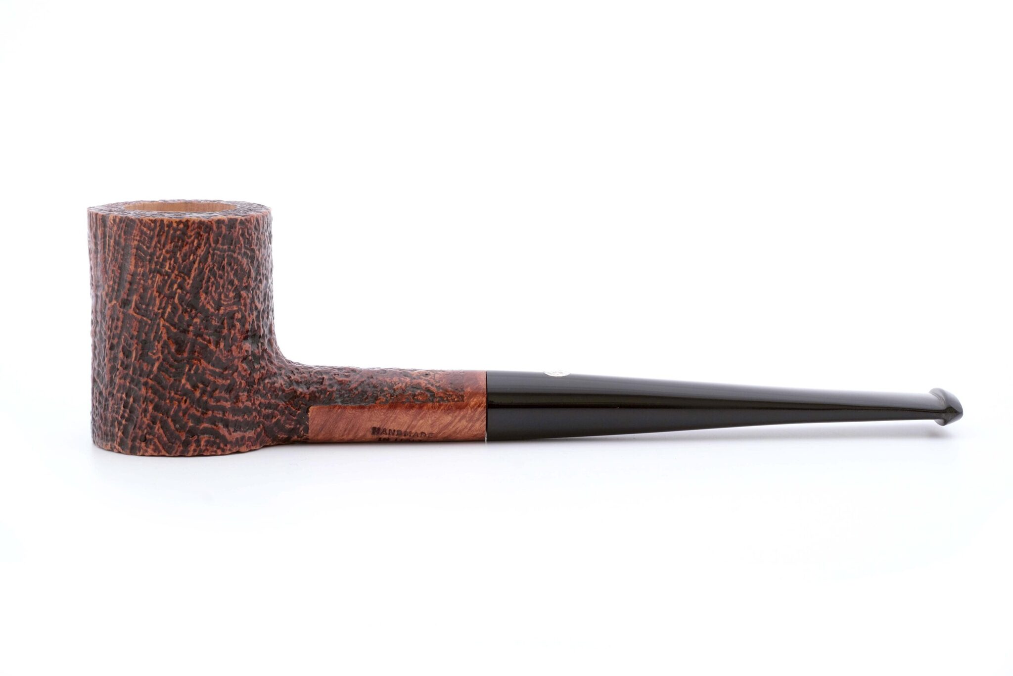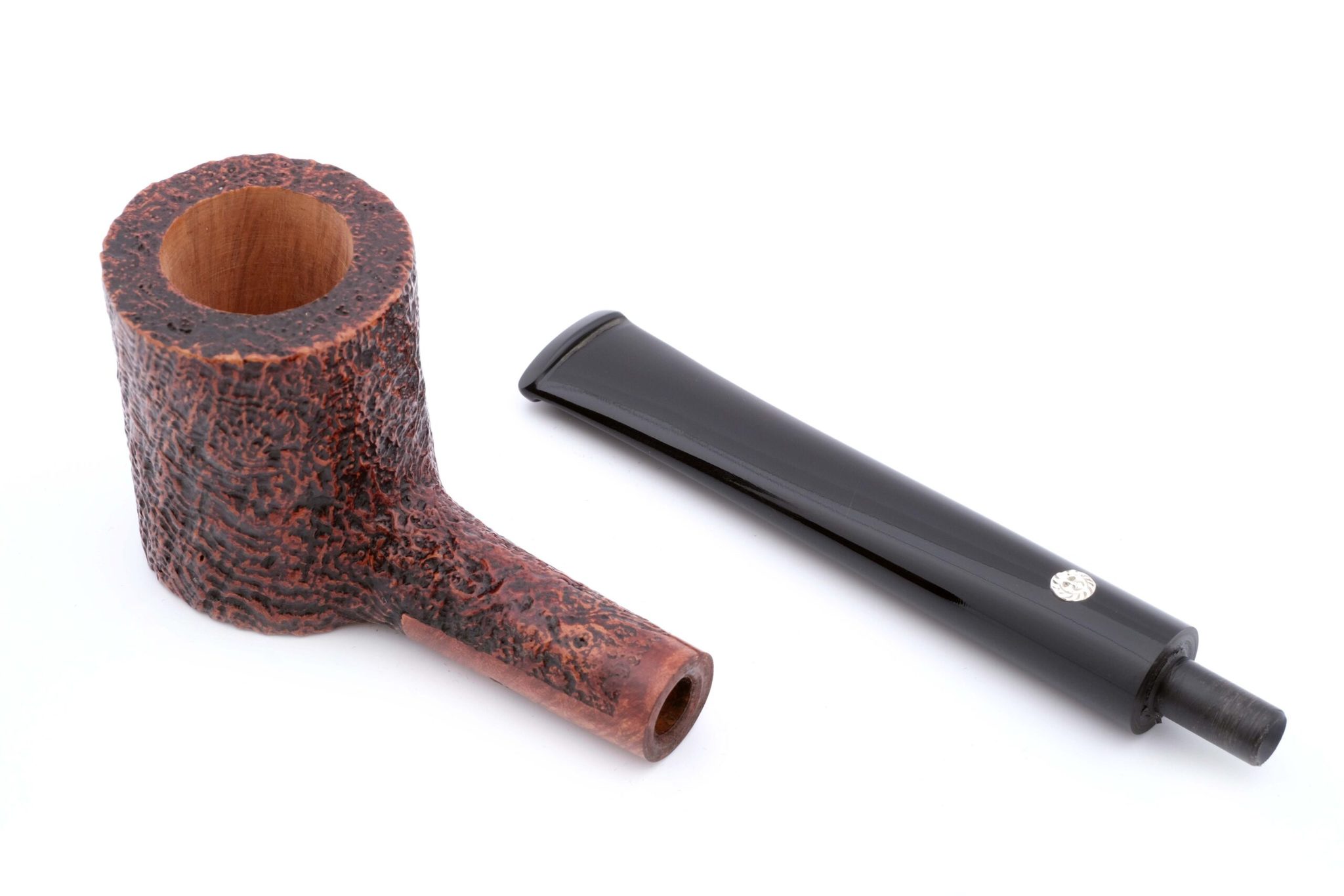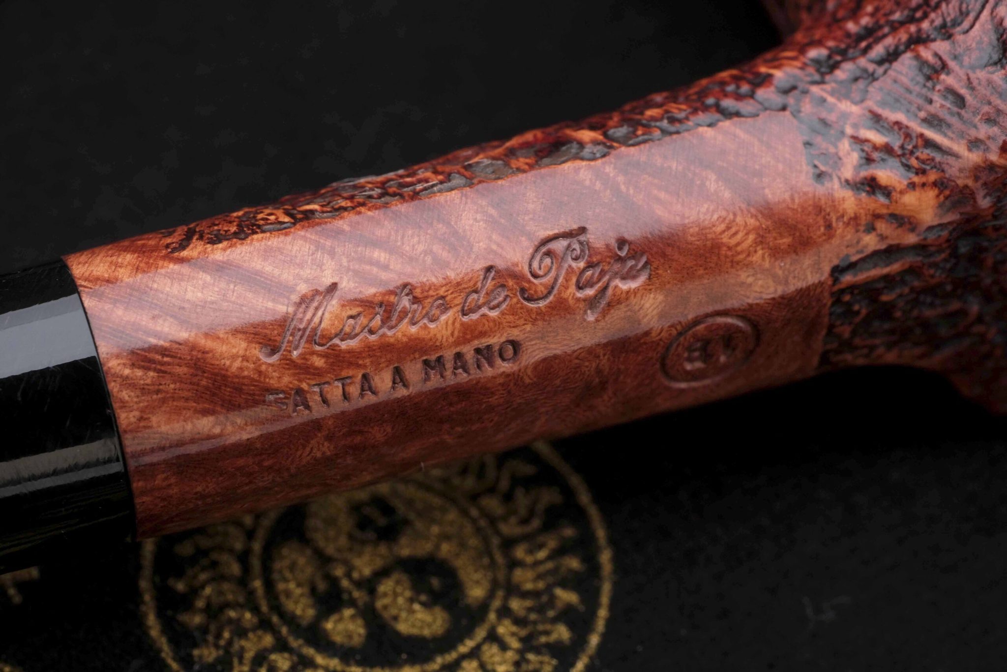 Удивительно легкая бесфильтровая авторская курительная трубка Мастро де Пайа грэйда 1B с отделкой Сэндбласт (когда мощная струя измельченного в песок стекла выбивает мягкие частицы корнекапа, оставляя твердые капилляры и придавая осязаемый объем натуральному рисунку бриара, площадь поверхности трубки при этом увеличивается, что способствует лучшему охлаждению чаши и более приятному "прохладному" курению, также снижается и вес трубки). Мундштук - акрил. Вес 45 гр. Длина трубки 15 см. Диаметр чашки 36 мм., высота чашки 47 мм. Диаметр табачной камеры 20 мм., глубина 34 мм. В комплекте фирменный кисет, подарочная коробка и буклет-каталог компании Mastro de Paja. Ручная работа, единственный экземпляр.