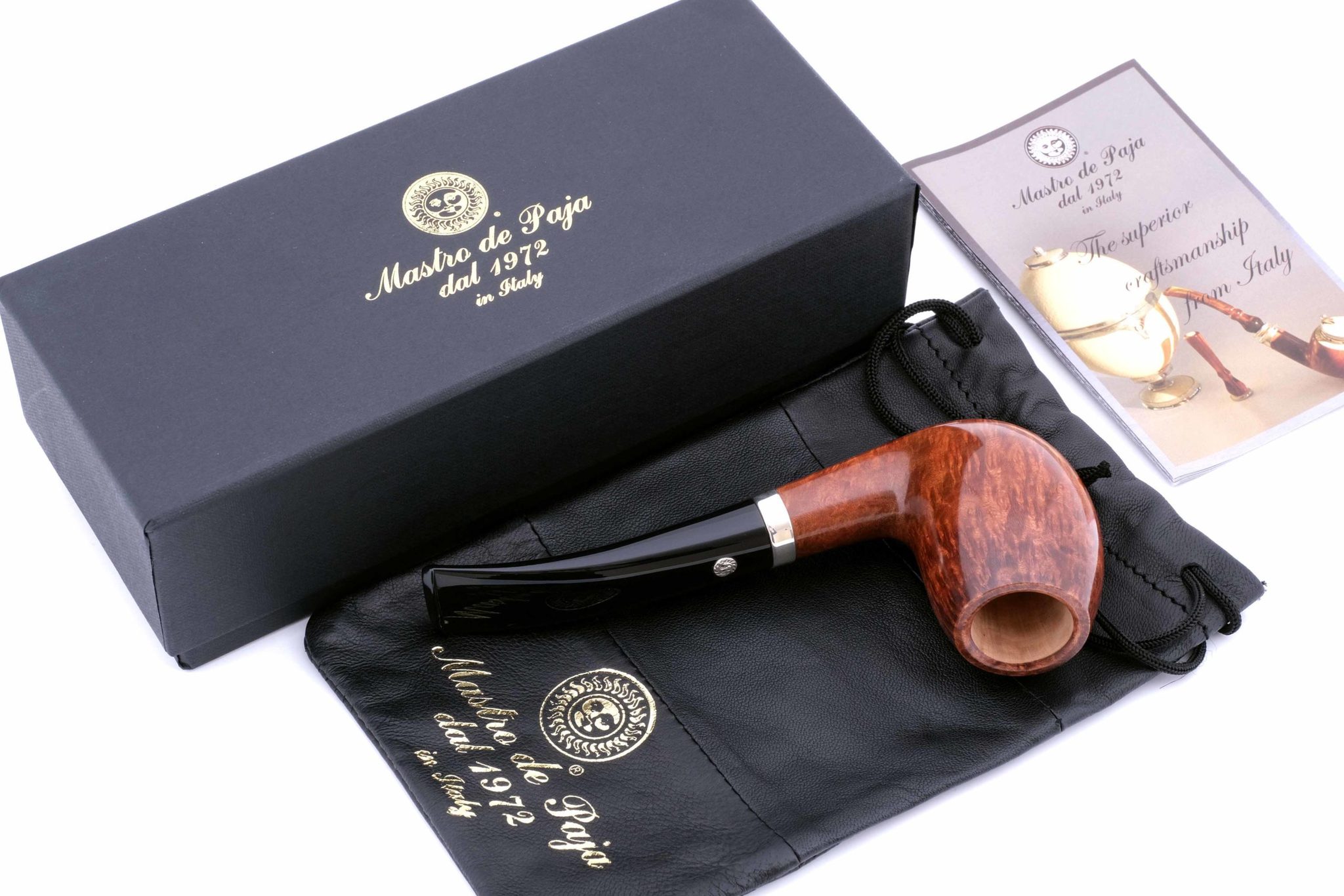 Мундштук — акрил. Кольцо на чубуке — серебро 925 пробы. Табачная камера не карбонизирована. В комплекте фирменный кисет, подарочная коробка и буклет-каталог компании Mastro de Paja.
