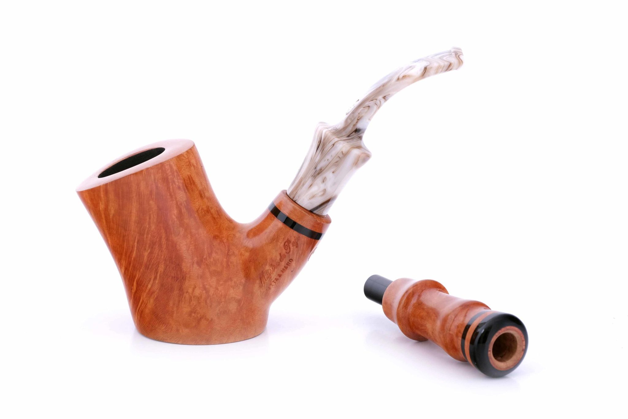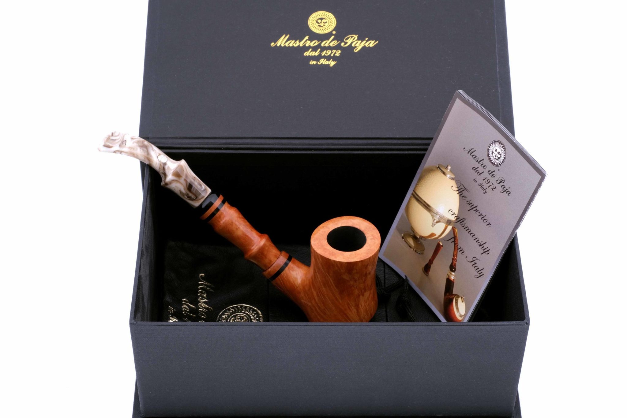 Мундштук — цветной акрил со вставкой из бриара. Табачная камера карбонизирована. В комплекте фирменный кожаный кисет, подарочная коробка и буклет-каталог компании Mastro de Paja.